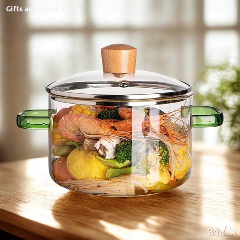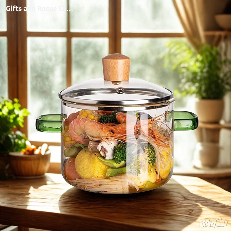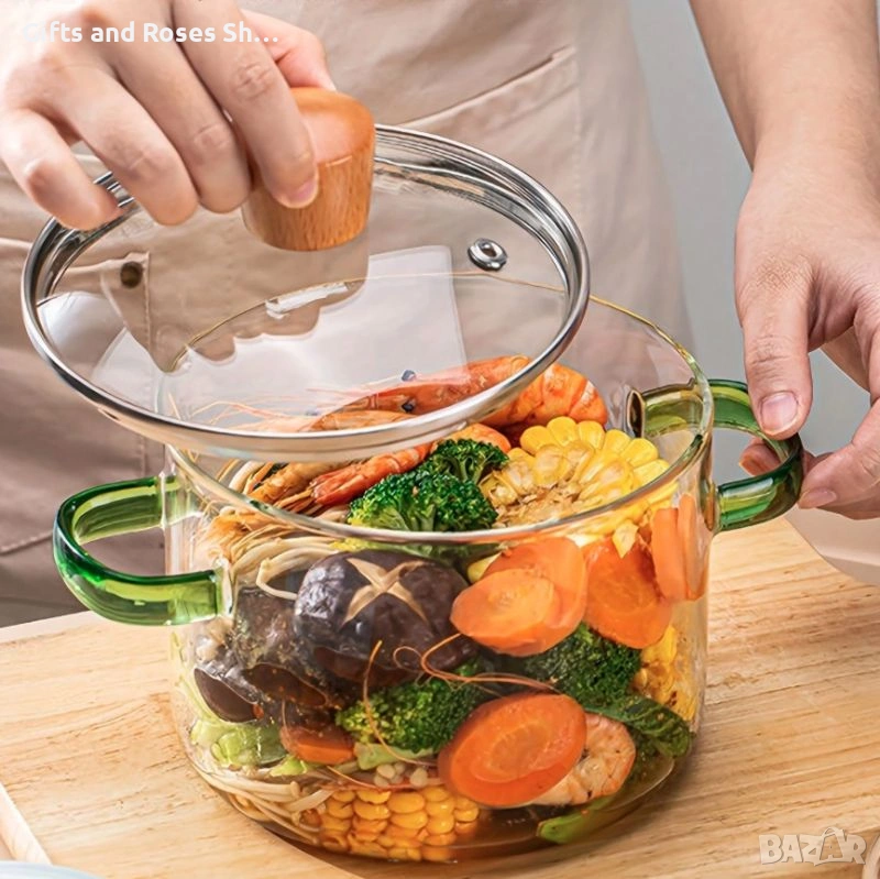 Прозрачен дизайн: Това е красив стъклен съд за готвене, при който лесно наблюдавате процеса на готвене, без да е необходимо да махате капака.