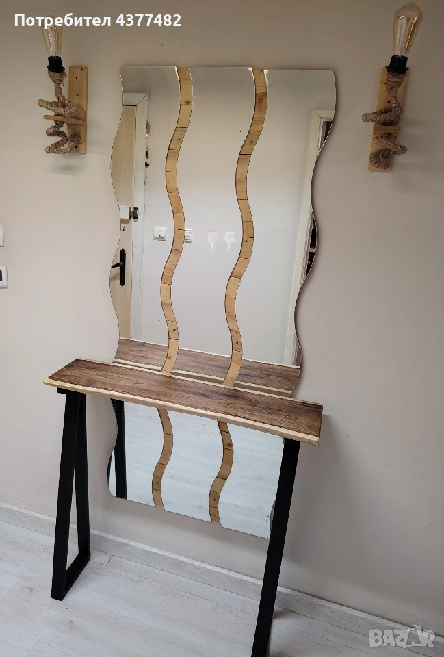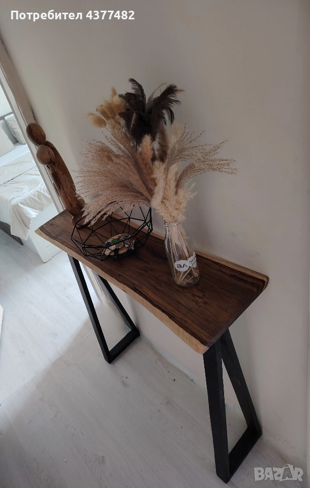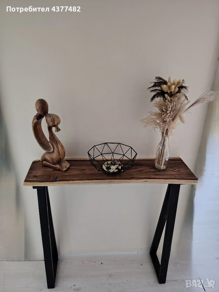 Конзолна маса от масивно дърво орех с жив ръб и метални крака. Много стилна и практична за всеки дом.
