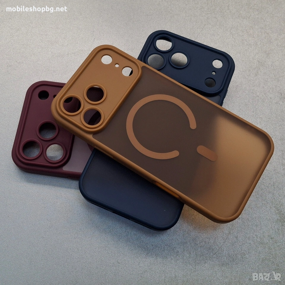 Кейс за iPhone 17 Pro Max. Стилен гръб MagSafe със защита на камерите. Кафяв, тъмно син и бордо. Ще ата е за един брой.