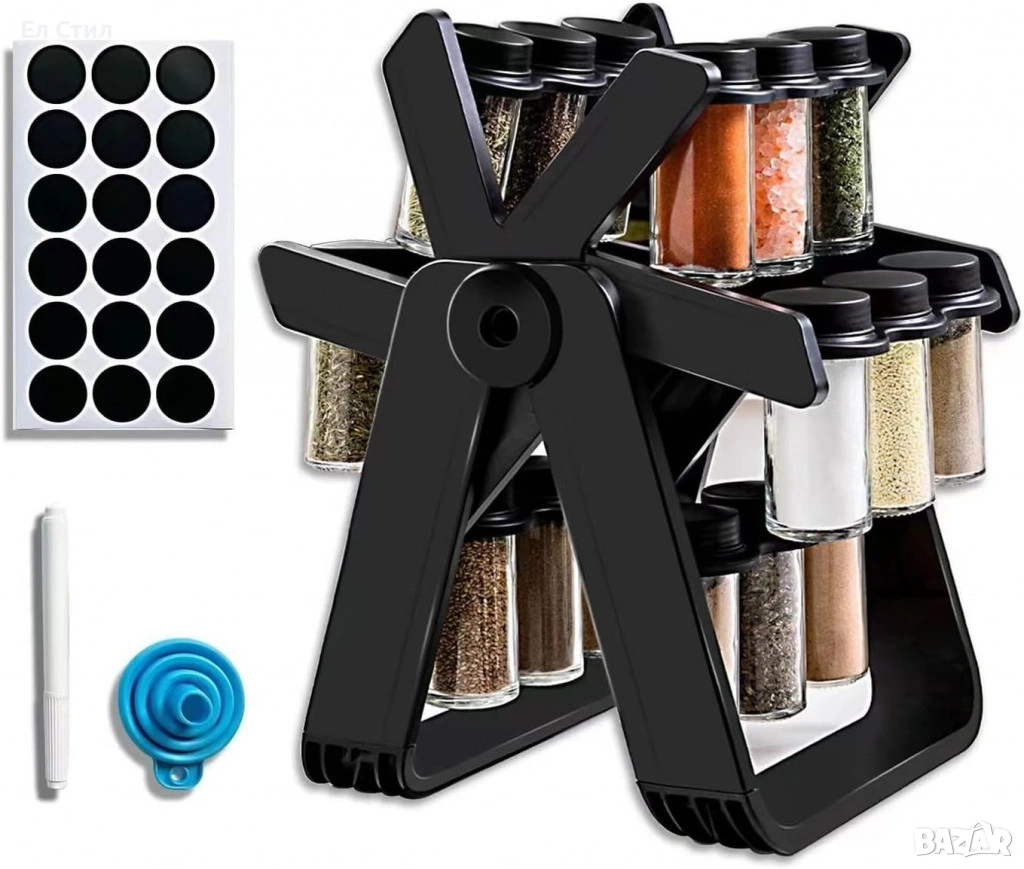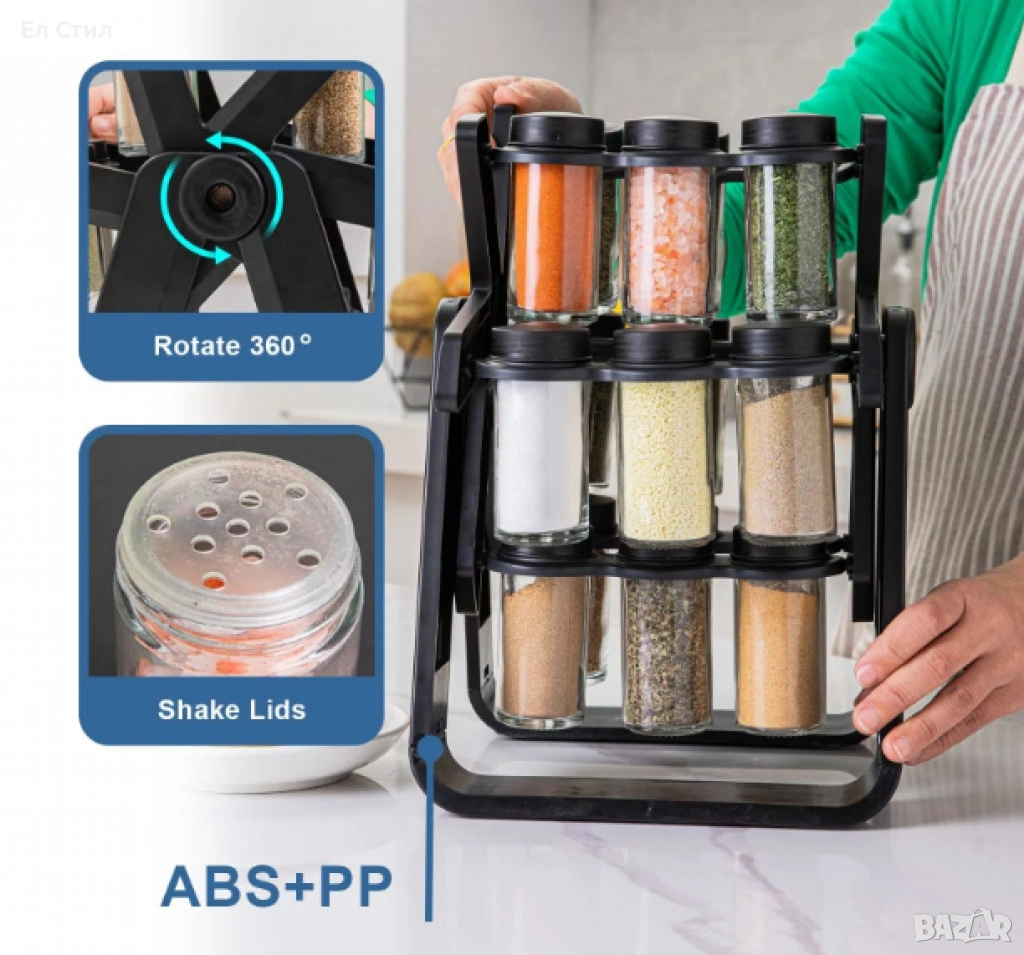 Въртящият органайзер за подправки с 18 стъклени бурканчета е идеалното решение за подредена и функционална кухня. Създаден да улесни достъпа до любимите ви подправки, този стилен органайзер запазва свежестта и аромата им. Изработен от висококачествено стъкло и снабден с въртяща се поставка, органайзерът е компактен и удобен за използване. Включва 18 бурканчета, идеални за съхранение на сол, пипер, кимион и други.
