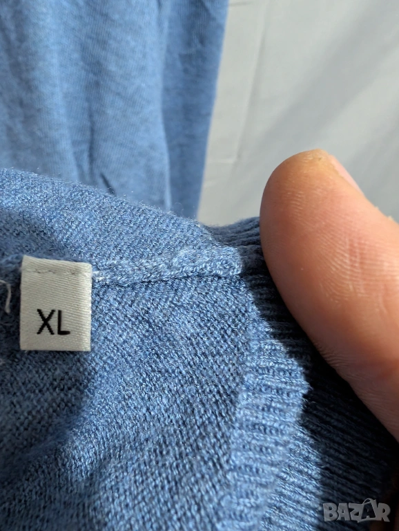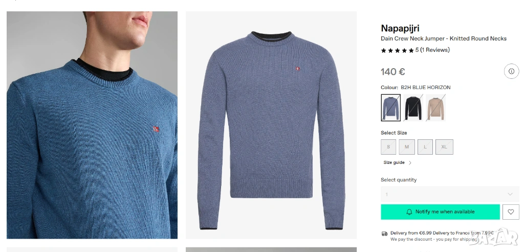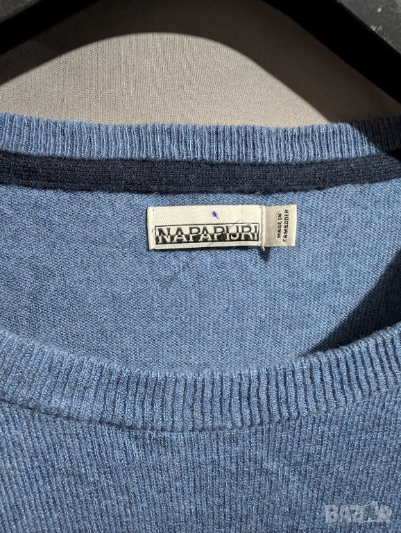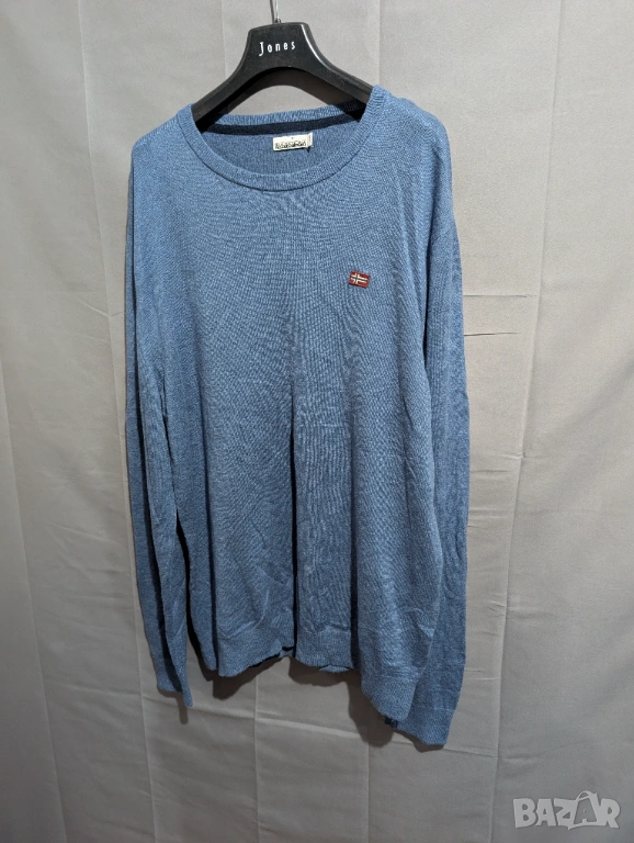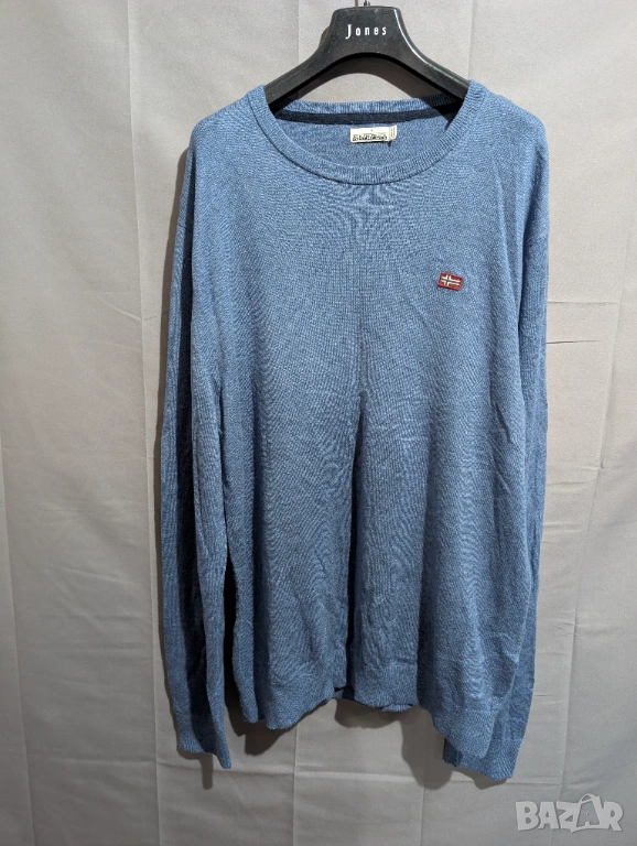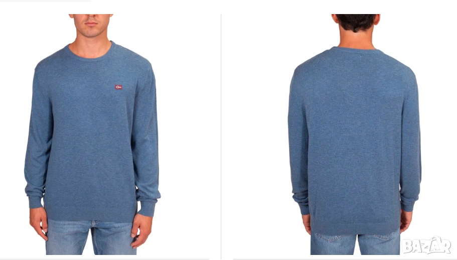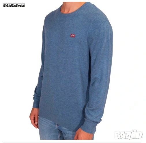 Синият пуловер модел с обло деколте, който много наподобява артикули от марките Napapijri Тези марки са известни с използването на подобни емблеми с норвежки флаг и изчистен дизайн на плетивото.