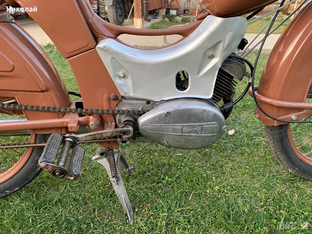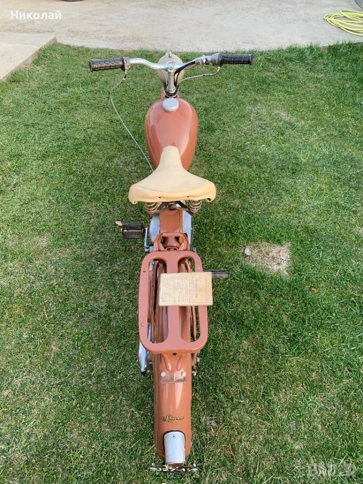 Ретро мотопед с педали Simson Sr2 в много добро състояние.Пали и върви.Има стар талон.Ламарината от ляво на двигателя е налична.