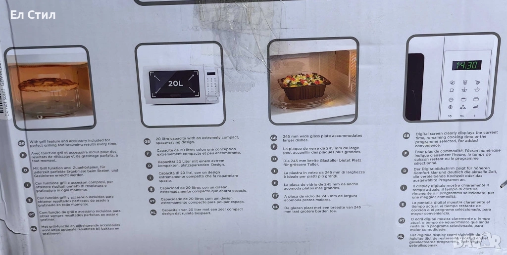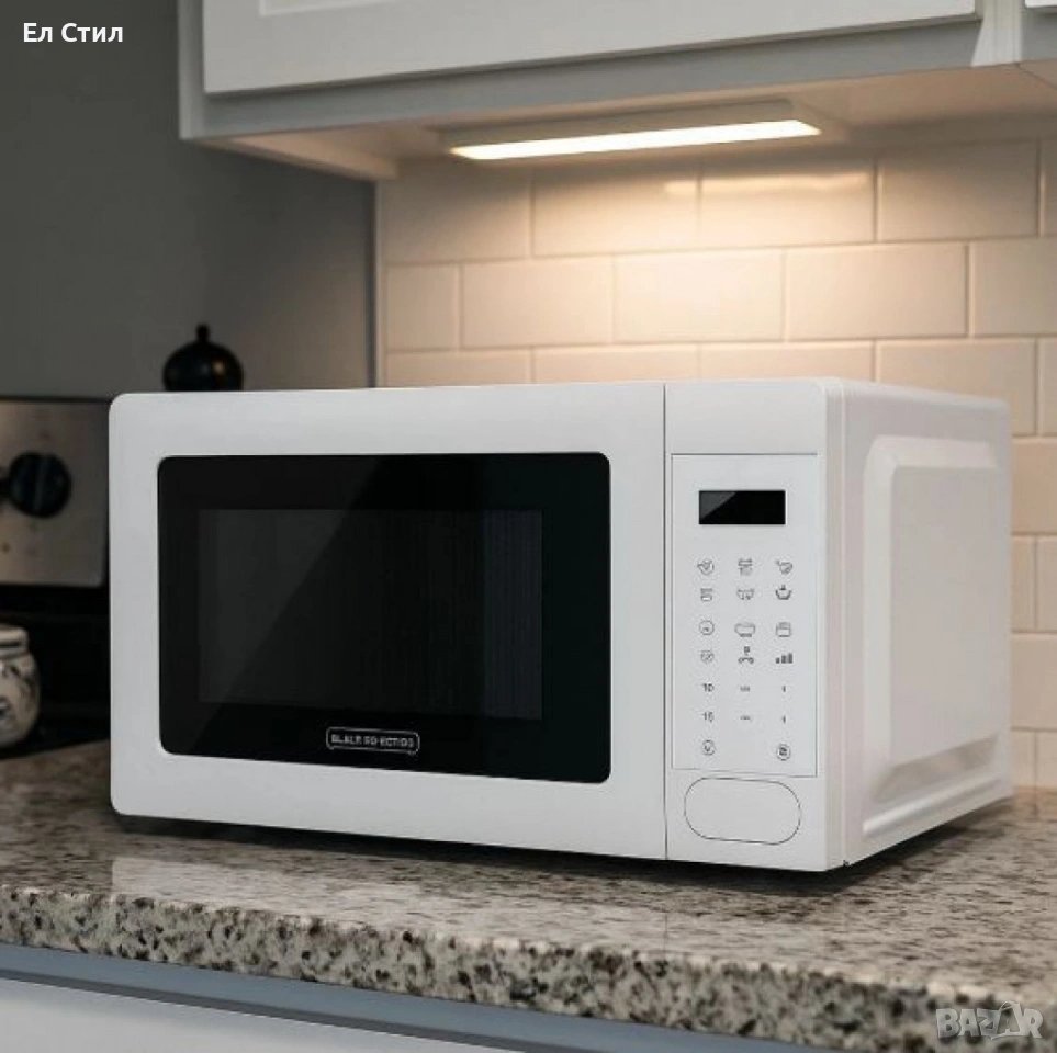 Продукт: Микровълнова с грил Black+Decker BXMZ701E; Капацитет: 20 L; Мощност: 700 W; Нива на мощност: 5; Функции: микровълнова, грил, комбинирани режими; Автоматични програми: Да; Таймер: до 95 минути със звуково предупреждение; Въртяща се чиния: Ø 245 мм; LED вътрешно осветление: Да; Управление: дигитално + бутони; Дисплей: с часовник и таймер; Размери: 455 × 360 × 259 мм (прибл.); Цвят: Бял.