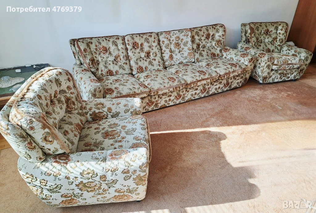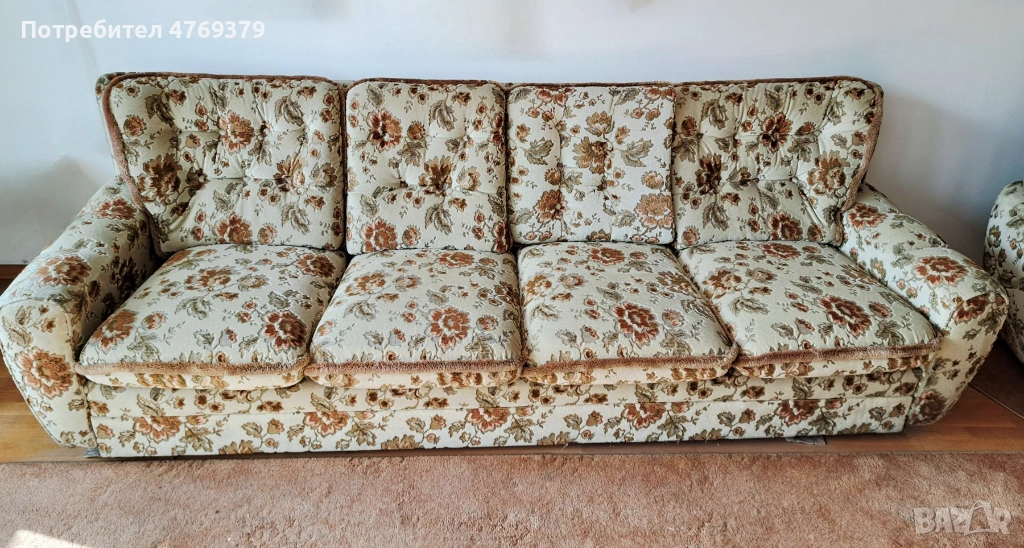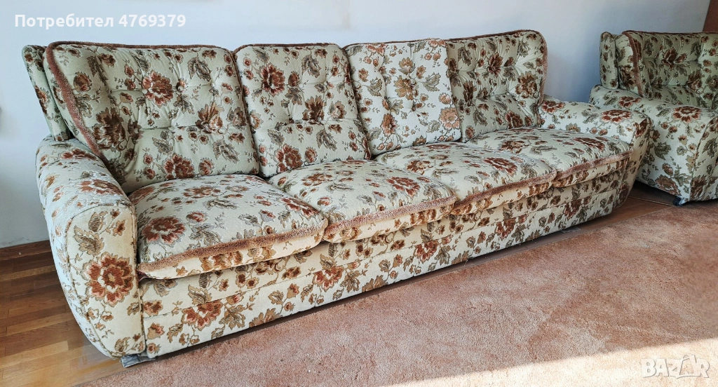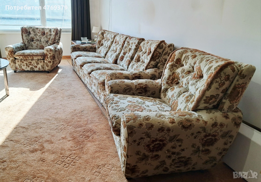 Предлагам поръчков стилен винтидж комплект мека мебел с изразен характер - 4-местен диван и два фотьойла.