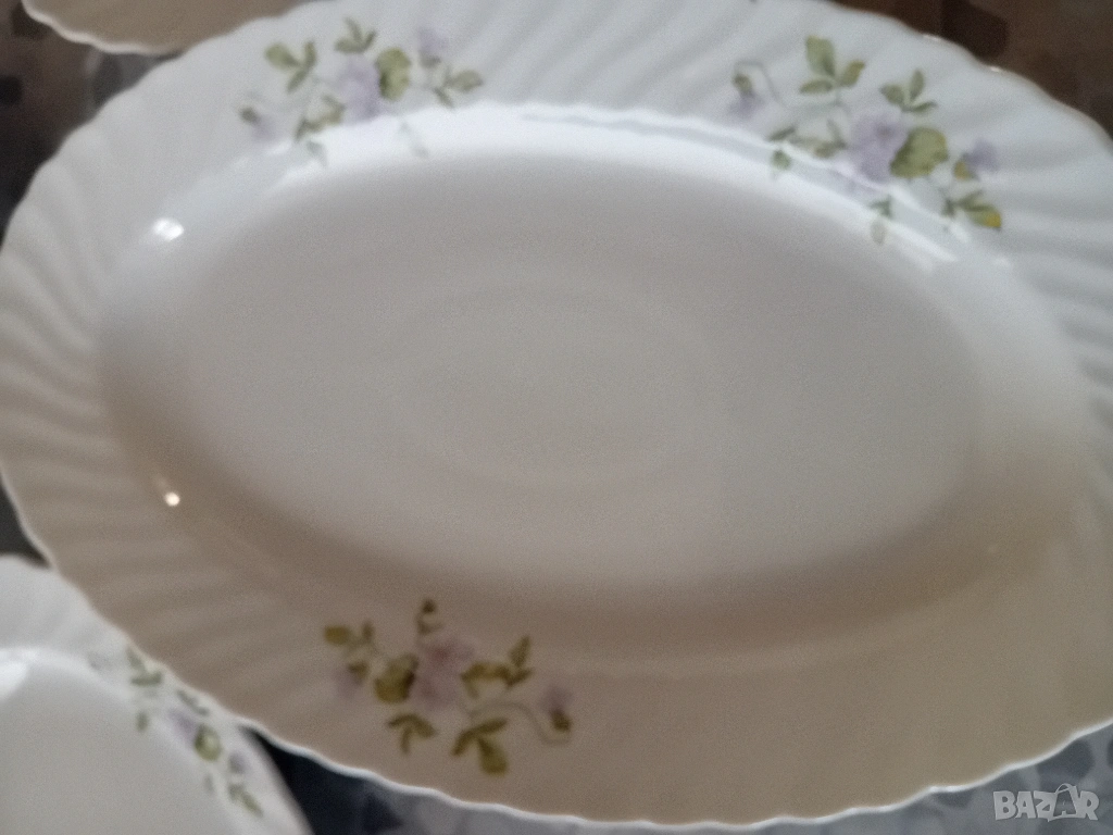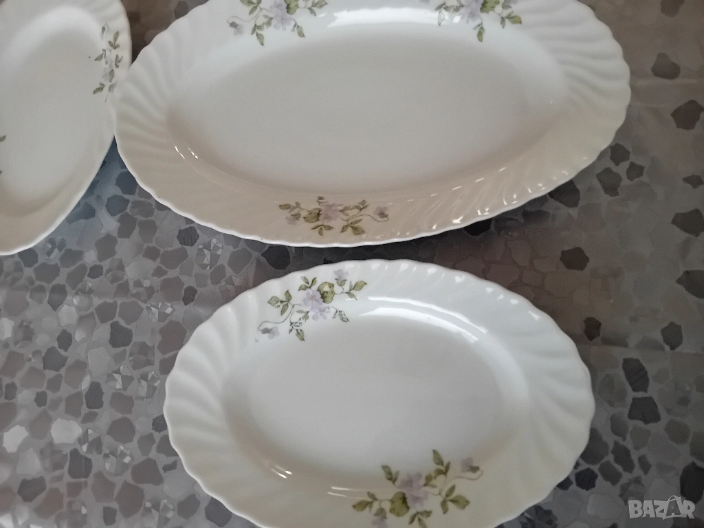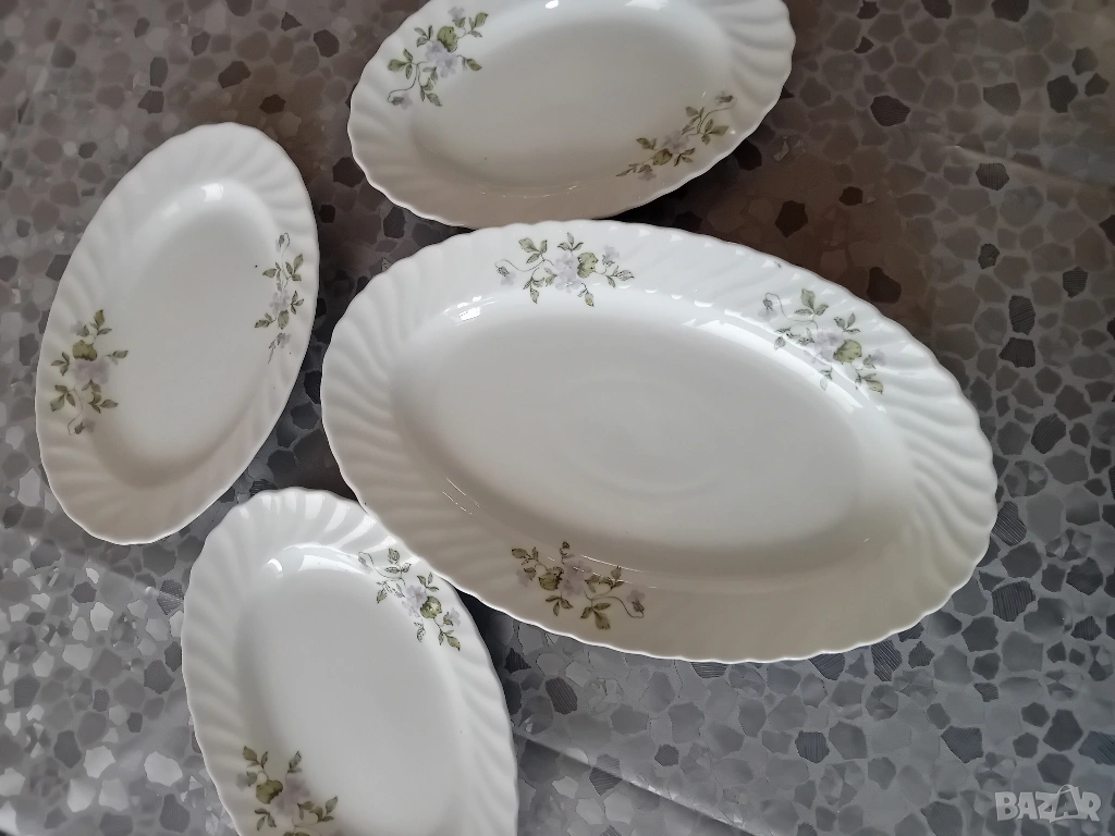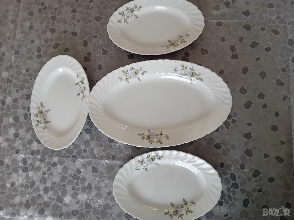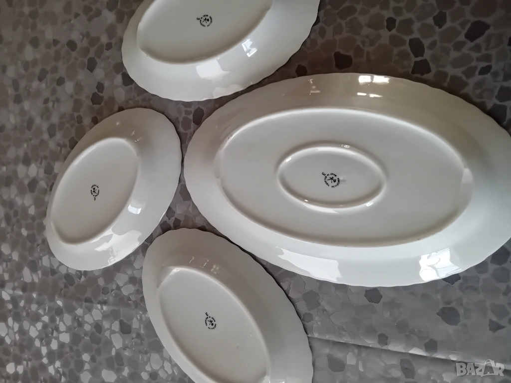 Комплект от елипсовидно порцеланово плато и три чинии. Много добро състояние.