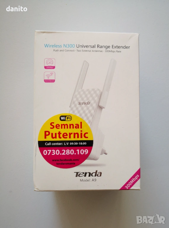 на разширителя най общо са следните 2.4GHz(300Mbps), 2x 3dBi външни антени Безжична