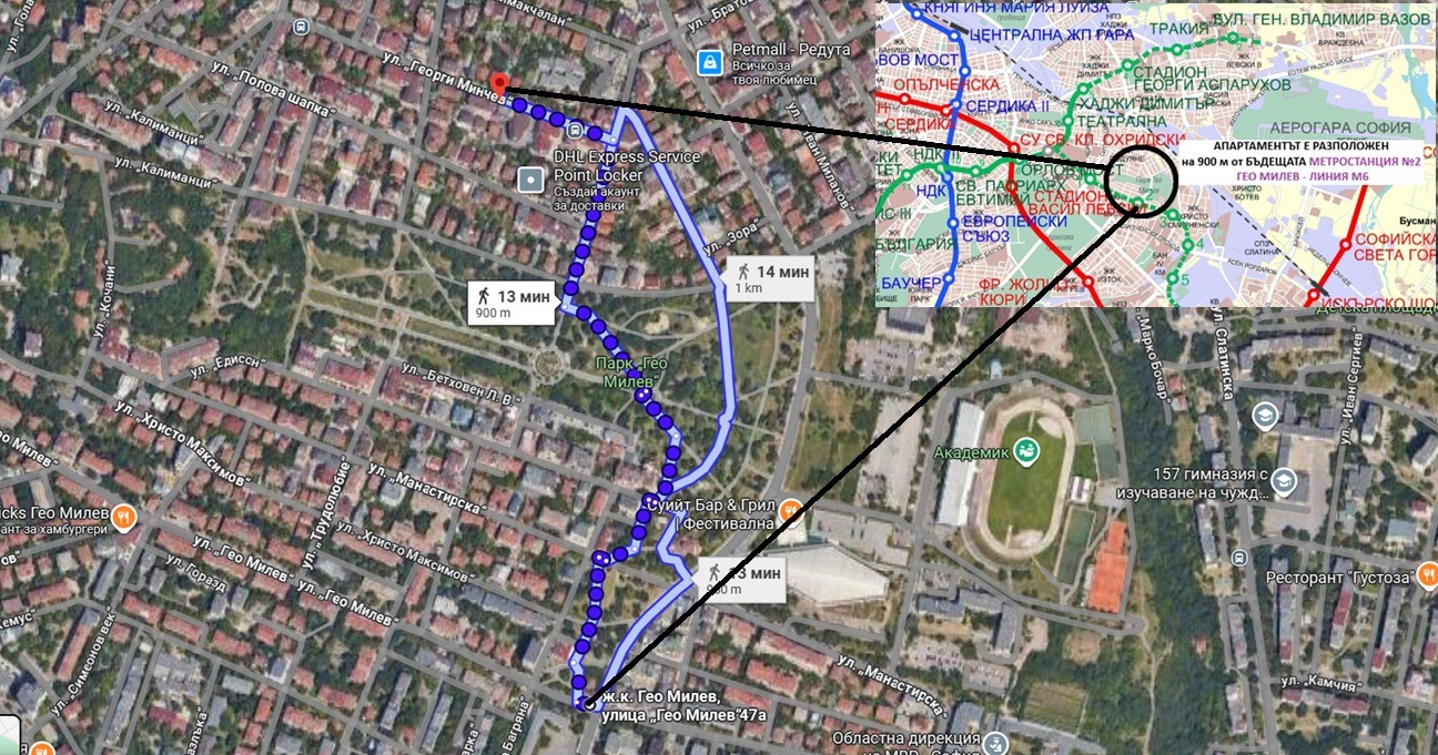 Имотът е с безупречна локация до парк Гео Милев, на 900 м. от бъдещата метростанция МС 2 Гео Милев). Автобус 72 има спирка на 50 м от входа на кооперацията.