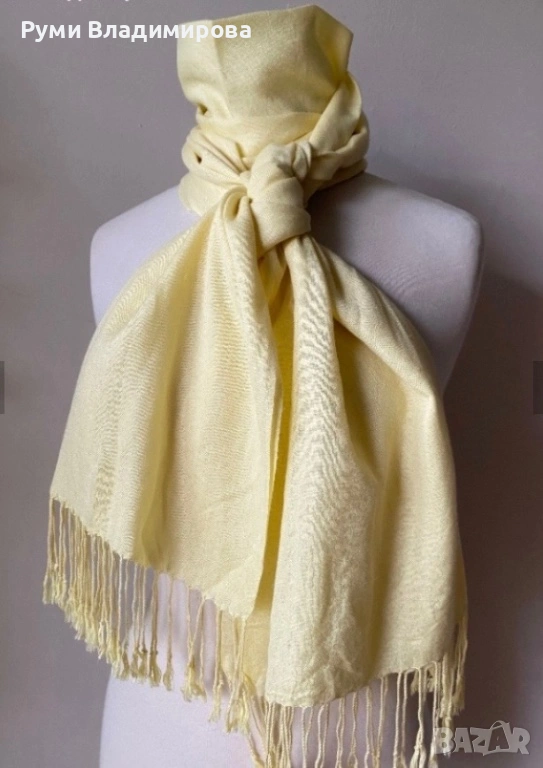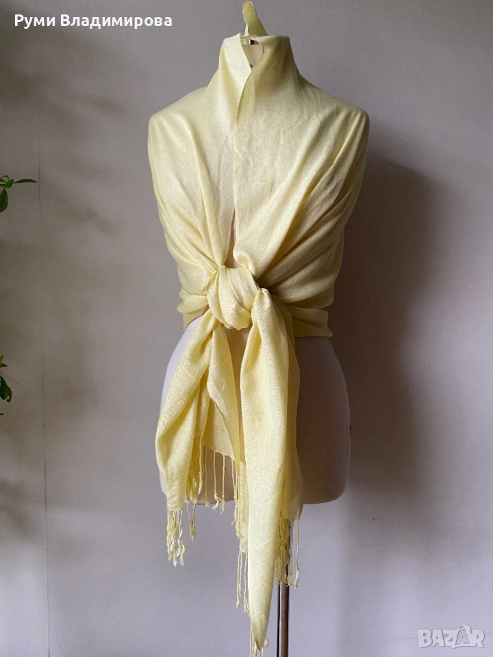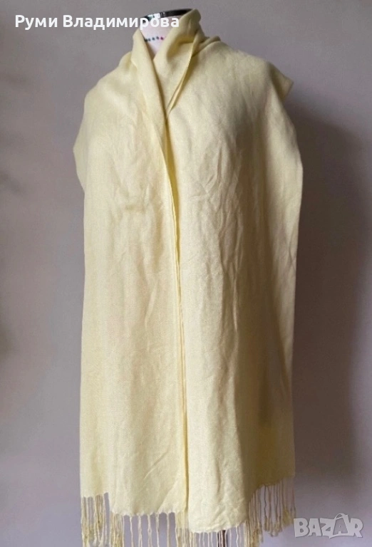 Бледо жълт шал от много фина материя според мен естествена, липсват етикети, много красив цвят ванилия, с ресни, размер 70 Х 186 см, доставка с Еконт.