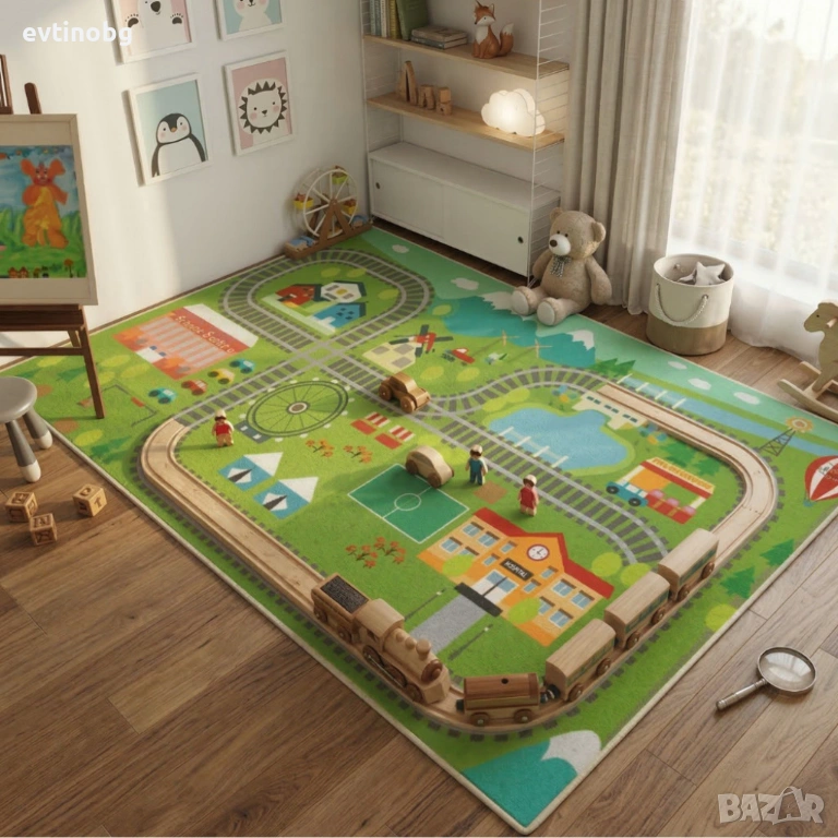 Детски килим за игра 120х160см - Яркозелен килим с влак и релси, противоплъзгащ и миещ се