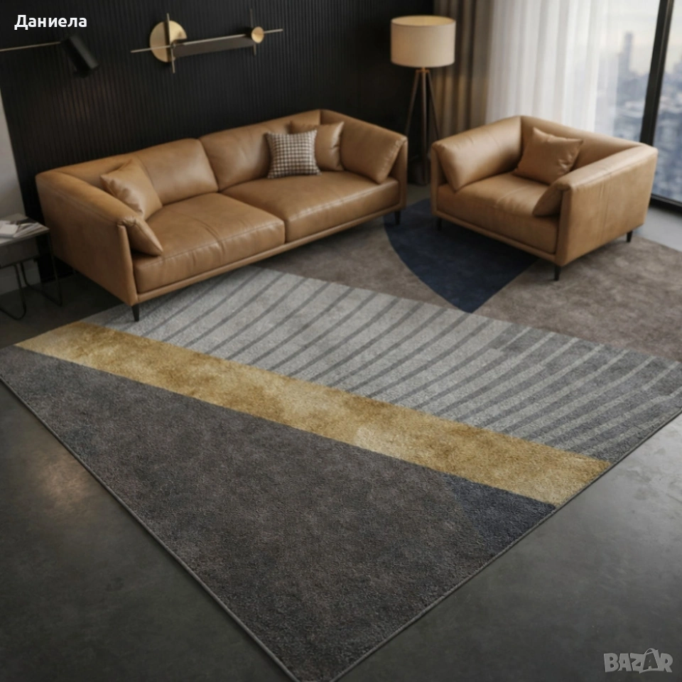 Технически характеристики на Модерен килим за хол 120х160см - Сиво с диагонална златна лента и 3D ефект, Противоплъзгащ Техническите параметри гарантират дълготрайност и удобство при употреба: Размер: 120 х 160 см — стандартен за холни зони и предни пространства Материал на повърхността: висококачествени синтетични влакна с 3D печат за наситени цветове Подложка: противоплъзгаща PVC/латекс основа за стабилно прилепване към пода Поддръжка: прахосмукачка за ежедневна грижа, влажно почистване за петна, професионално почистване при необходимост Съвместимост: подходящ за повечето подови настилки и системи за подово отопление при нормални работни температури 1бр-33€ 2бр-58€