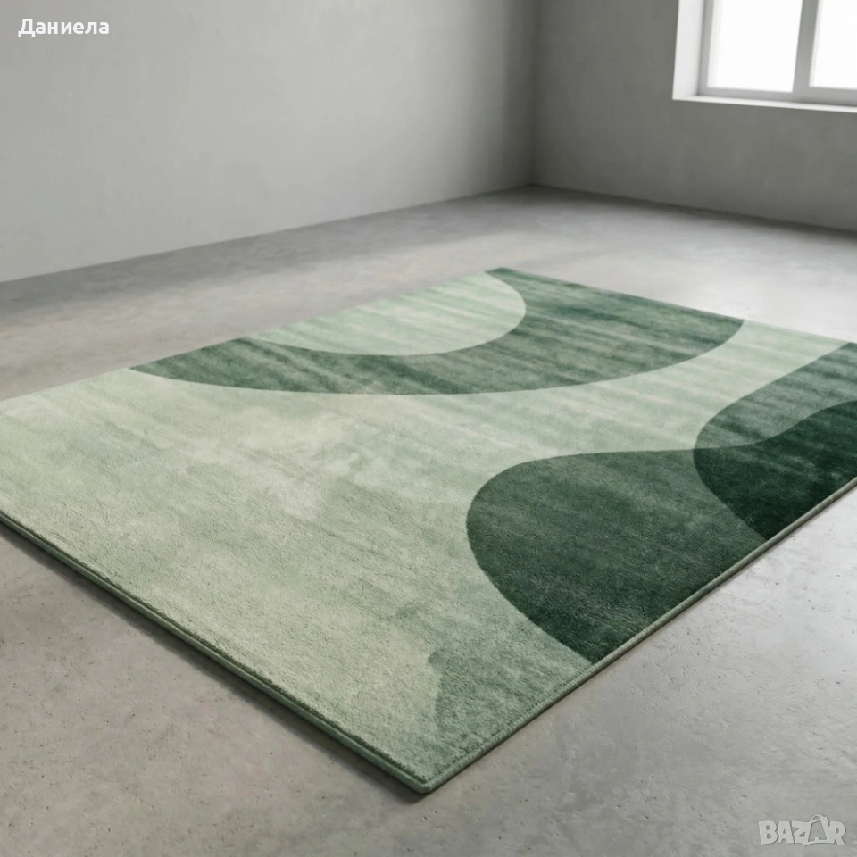 Технически характеристики на Модерен килим за хол 120х160см - Зелени вълни на светъл фон и 3D ефект, Противоплъзгащ Техническите параметри гарантират дълготрайност и практичност при ежедневна употреба: Размер: 120 x 160 см — оптимален за холни зони и пространство пред диван. Материал горна повърхност: меки синтетични влакна с 3D печат за наситени и устойчиви цветове. Подложка: противоплъзгаща PVC/латекс основа за сигурност и стабилност. Поддръжка: прахосмукачка за ежедневна грижа, влажно почистване на локални петна; при силни замърсявания професионално почистване. Съвместимост: подходящ за повечето системи за подово отопление при нормални температури. 1бр-33€ 2бр-58€