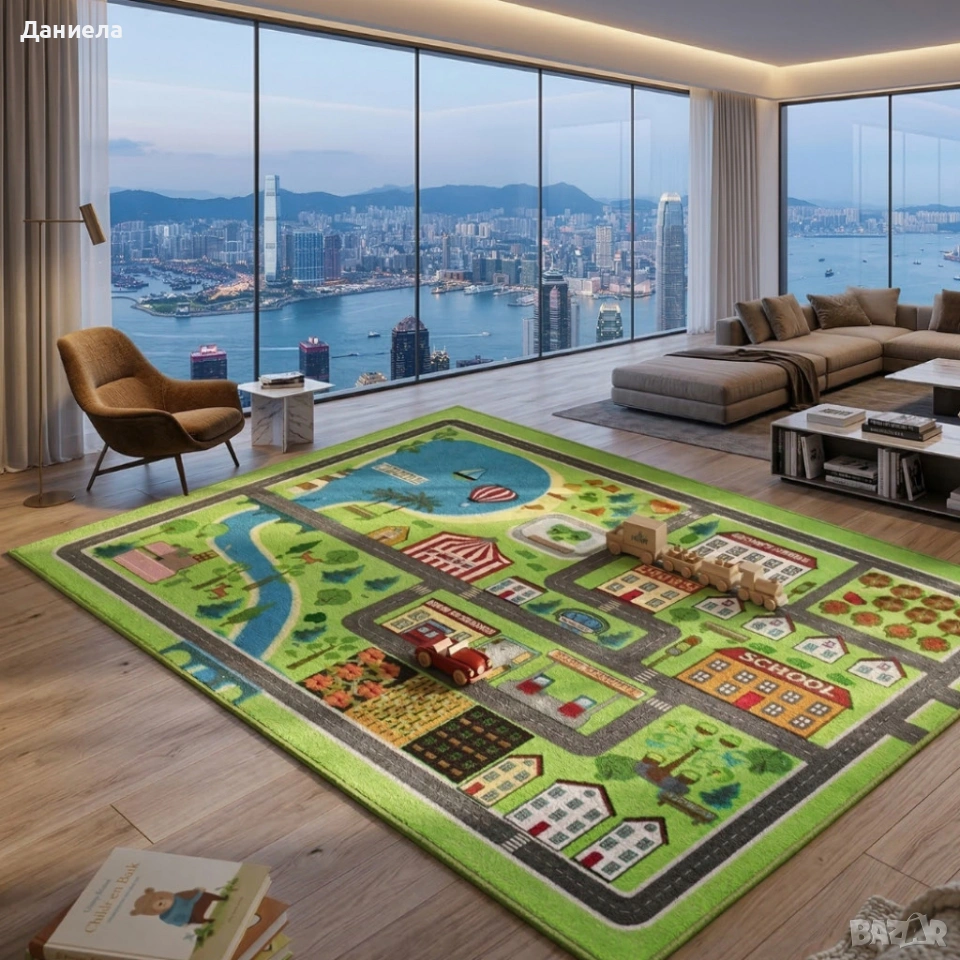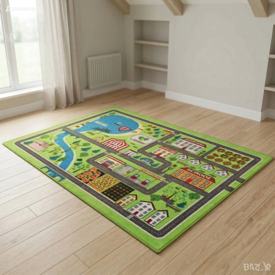 Размери: 120 cm × 160 cm Материал лице: мека, водоустойчива повърхност, лесна за почистване Материал гръб: нетъкан текстил против плъзгане и устойчив на надрасквания Цвят и варианти: 12 различни дизайна, ярки и детайлни Зелен килим с училище и пътища Светло жълт килим с цветни къщички Пясъчен килим с жираф и розова дама Бял килим с динозавър и дама-палма Яркозелен килим с влак и релси Тъмнозелен килим с автописта Жълт килим с планети и дама Тъмносин килим с космос и пътека числа Светлозелен килим с ферма и животни Зелен килим с голям град и езеро Тъмносин килим с облачета и дъга Лилав килим с ракета и дама Функционалност: сгъваема, лека за пренасяне, подходяща за целогодишна употреба 1бр-33€ 2бр-58€