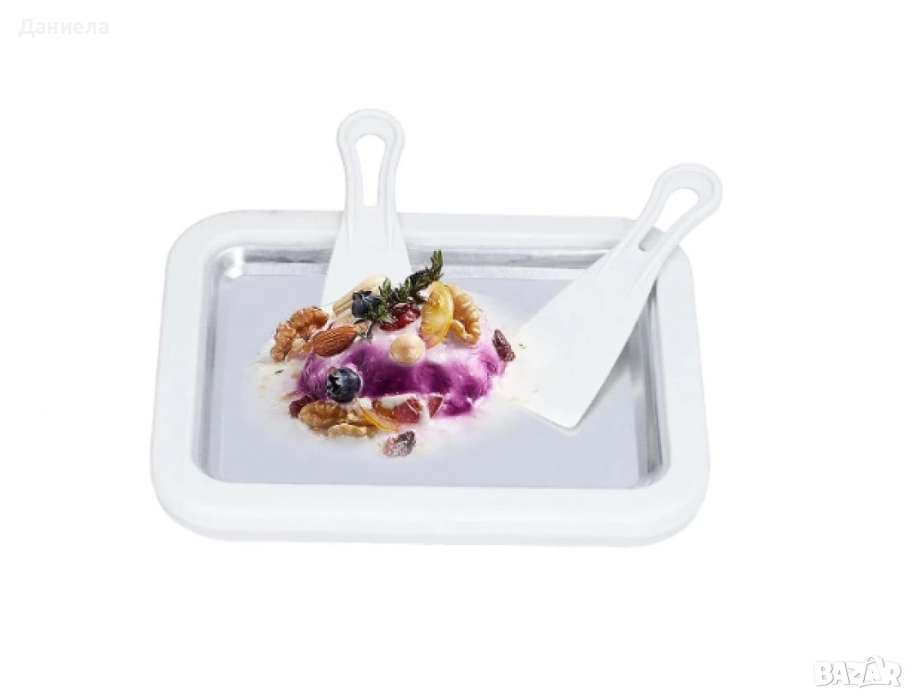 Плоча за сладолед; Тази плоча за тайландски сладолед е иновативен и забавен начин да приготвите замразени десерти у дома. Подходяща е както за деца, така и за възрастни, като превръща процеса на приготвяне на сладолед в истинско изживяване. С помощта на замразената повърхност и включените шпатули можете да създадете тайландски сладолед на рула, сорбе или други видове десерти с любимите ви съставки. Размери на плочата: приблизително 30 x 22 cm; Материали: неръждаема стомана и устойчива пластмаса; Температурен обхват: работи най-добре след минимум 12 часа във фризер; Не се нуждае от електрическо захранване; 1 бр. замразяваща плоча за тайландски сладолед; 2 бр. шпатули за оформяне и събиране на сладолед.