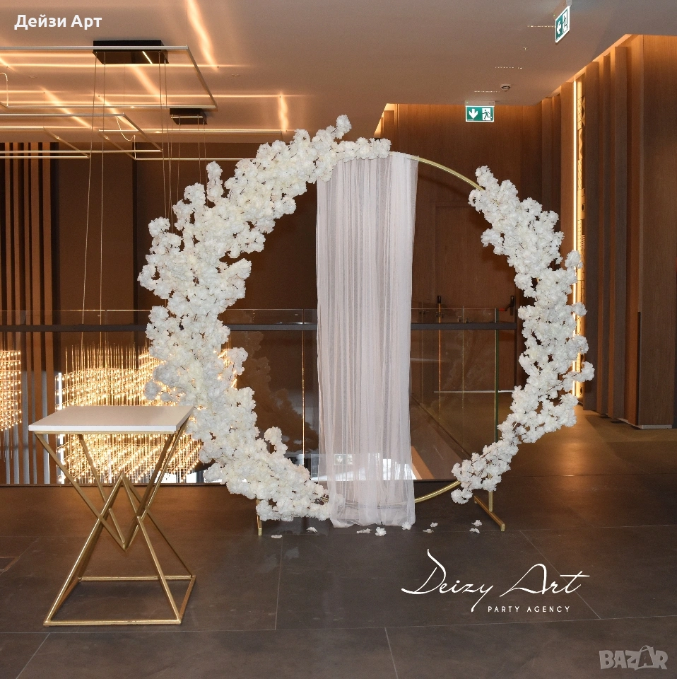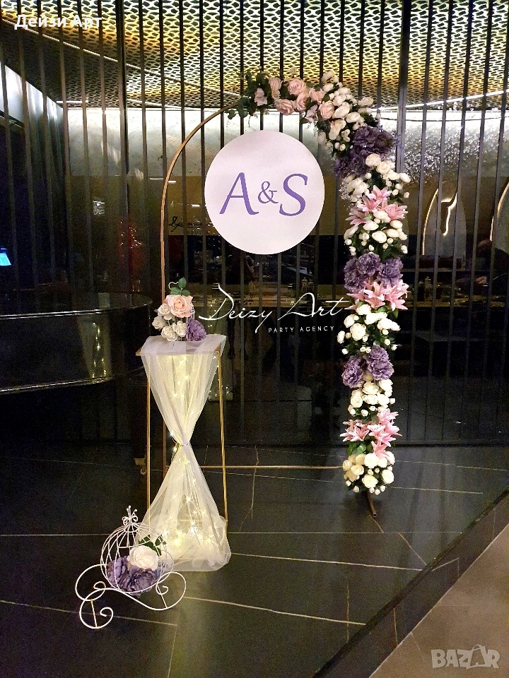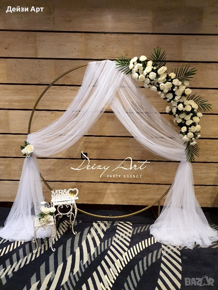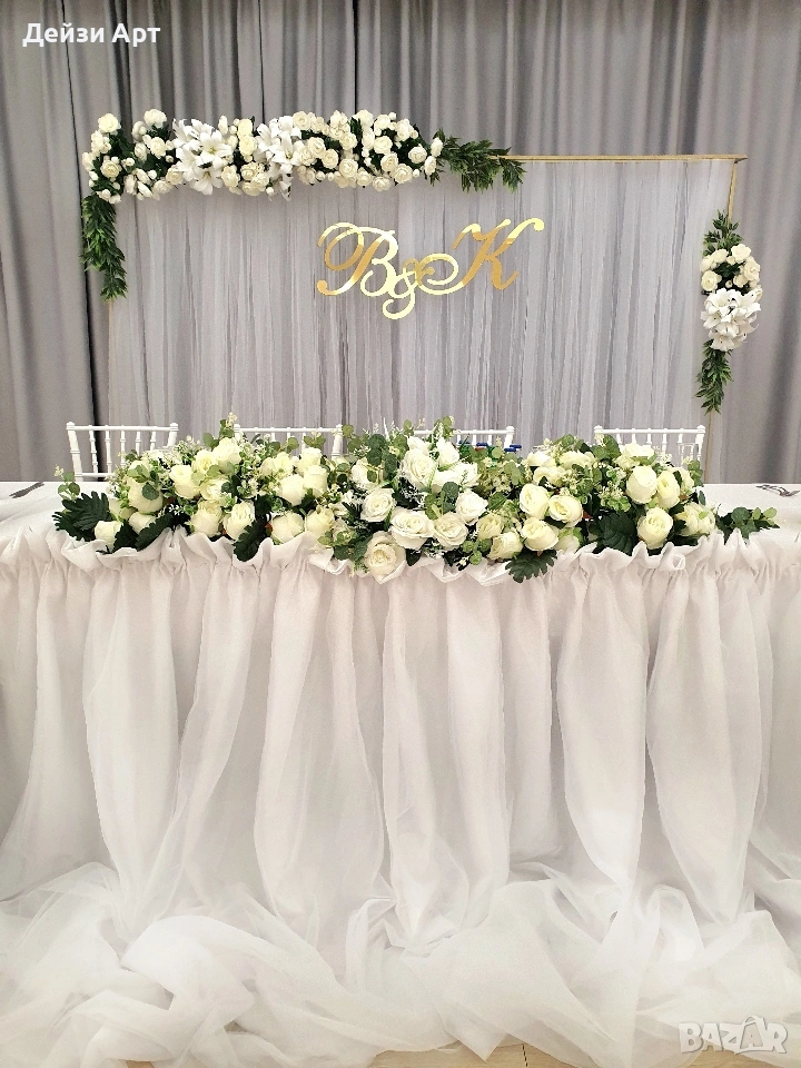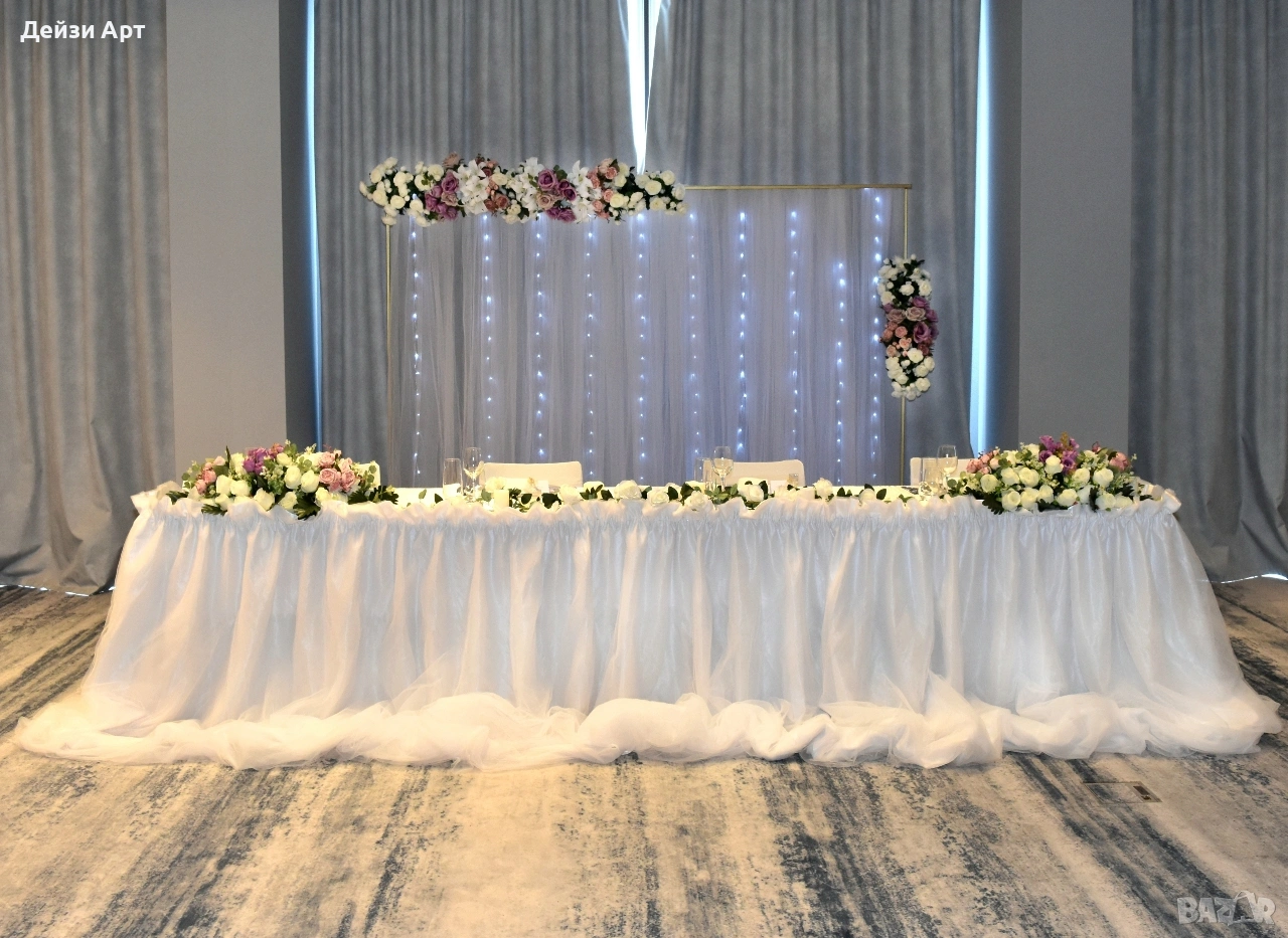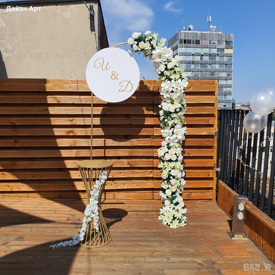 Украса под наем за Сватба, само за гр.София!!! -Украса на младоженска маса (бяла драперия +воал в цвят по ваш избор и декораций) -Гръб на младоженска маса -Фото кът за младоженци -Арки различни модели-кръгла,правоъгълна,арки дъги(могат да бъдат украсени с цветя,балони и воали, по ваш избор) -Масички различни модели,включват се към фото къта(може да се слагат на тях кутия за пари,цветя,декораций и др.) -Статив за "Добре дошли" -Маса с драперия за "Welcome drink" -Вази с декоративни цветя за масите за гостите и номера за всяка маса Facebook: Deizy Art-Party Agency Instagram: deizy.art_party.agency_1