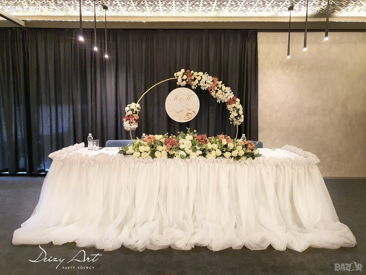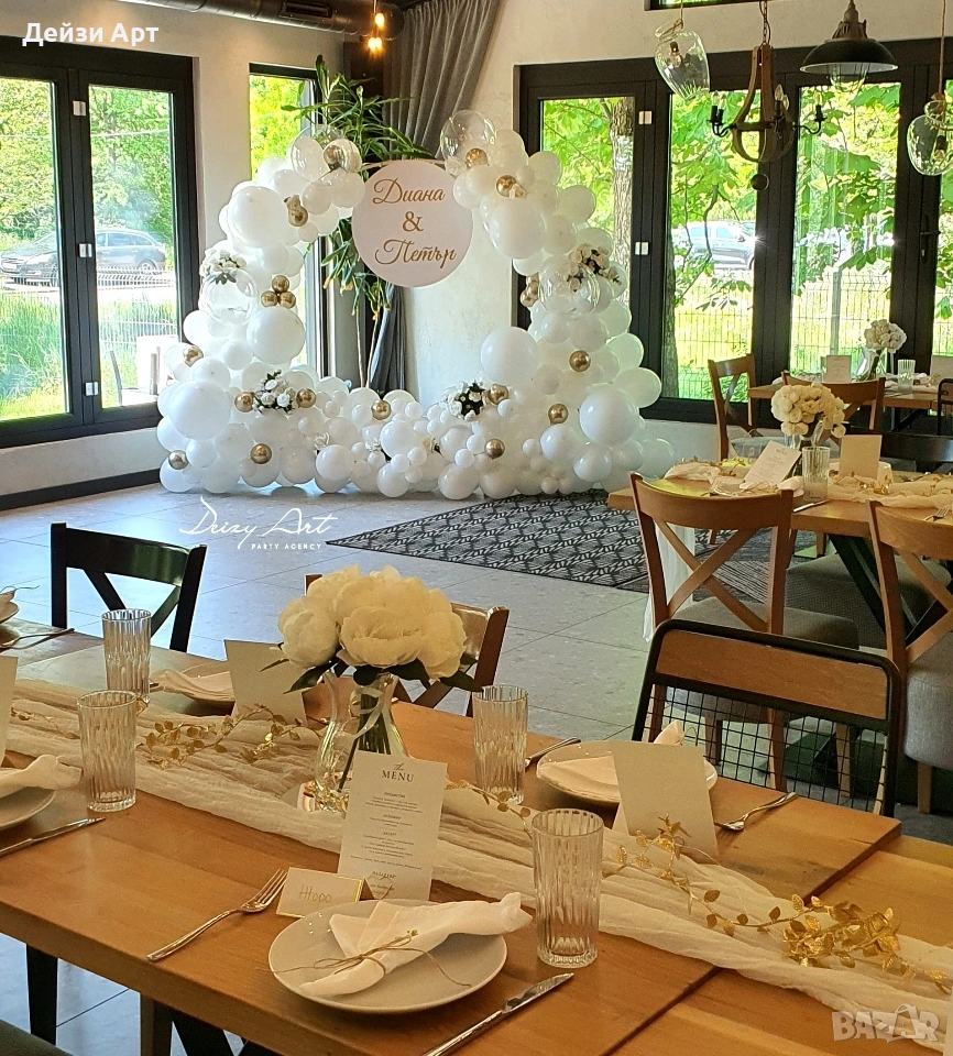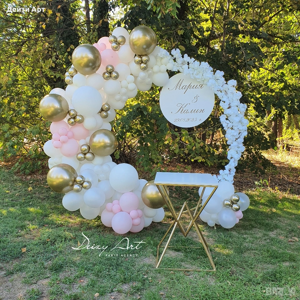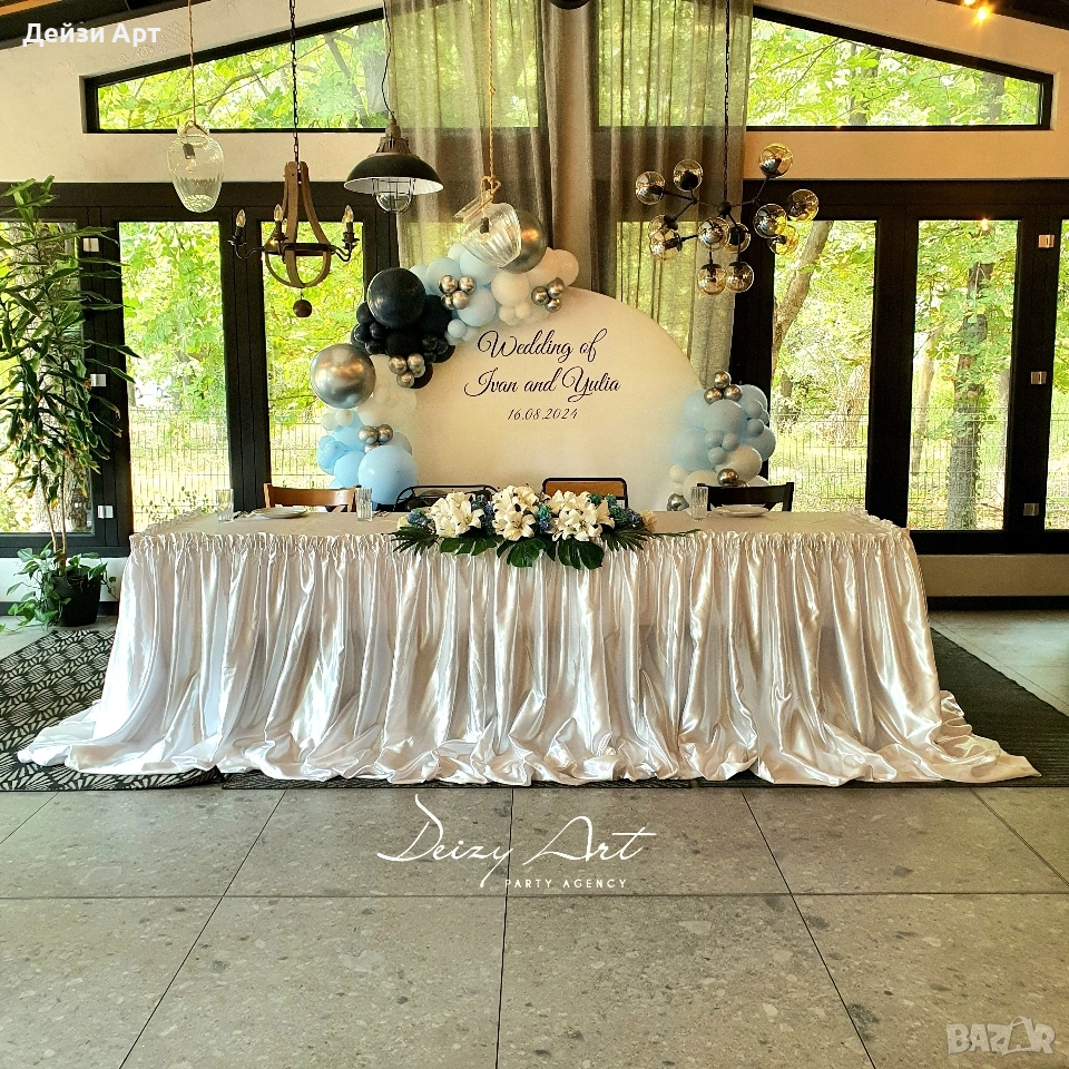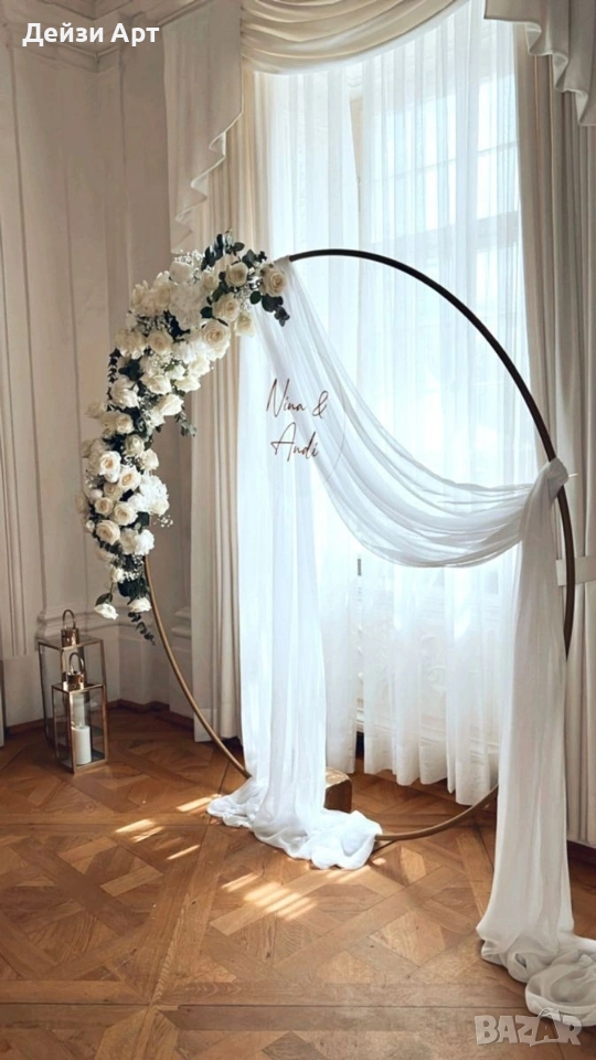 Украса под наем за Сватба, само за гр.София!!! -Украса на младоженска маса (бяла драперия +воал в цвят по ваш избор и декораций) -Гръб на младоженска маса -Фото кът за младоженци -Арки различни модели-кръгла,правоъгълна,арки дъги(могат да бъдат украсени с цветя,балони и воали, по ваш избор) -Масички различни модели,включват се към фото къта(може да се слагат на тях кутия за пари,цветя,декораций и др.) -Статив за "Добре дошли" -Маса с драперия за "Welcome drink" -Вази с декоративни цветя за масите за гостите и номера за всяка маса Facebook: Deizy Art-Party Agency Instagram: deizy.art_party.agency_1