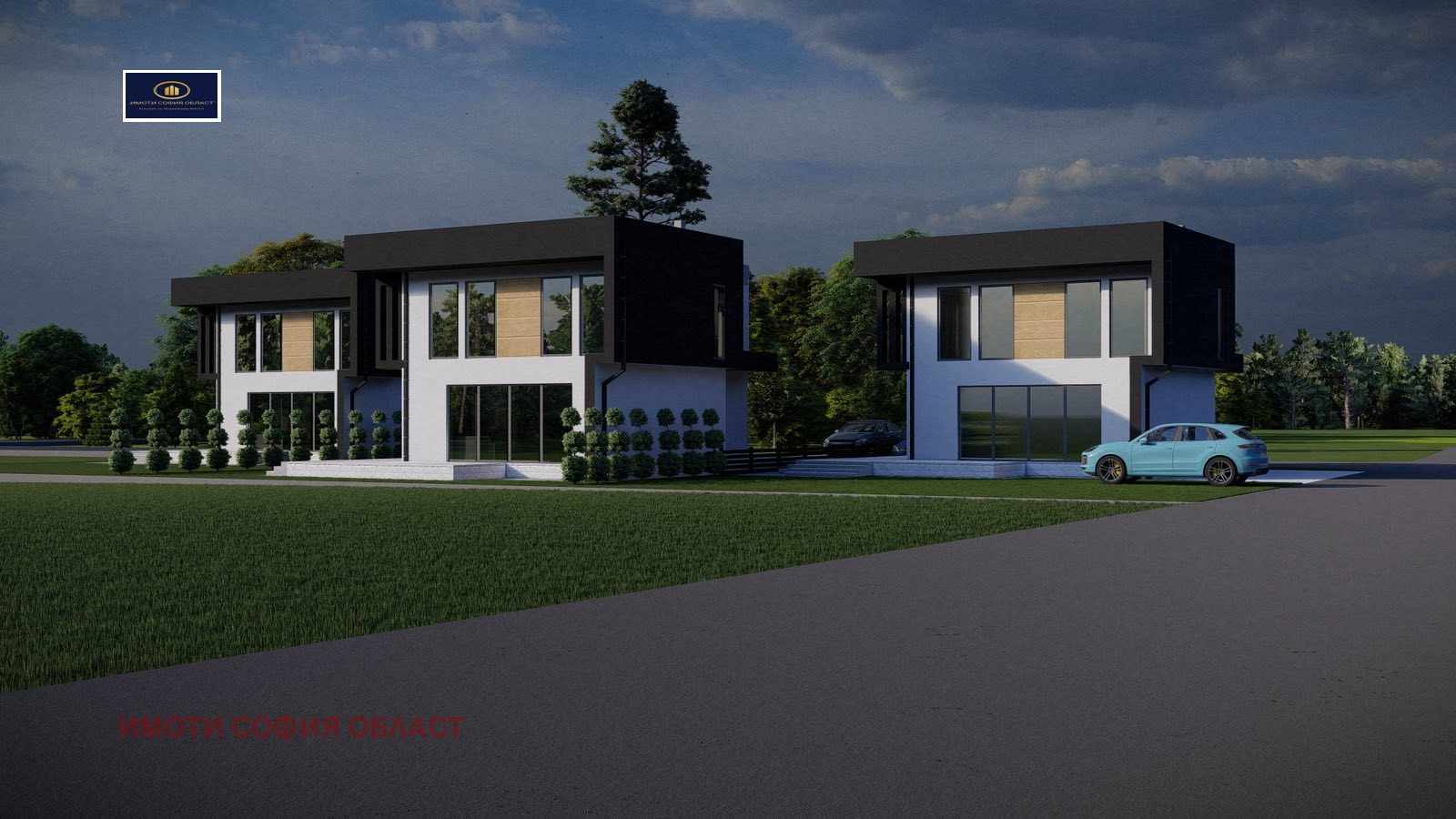 - ДВОР: Външните граници към прилежащите дворни площи на всяка къща са оградени с плътна ограда, бетонен фундамент 50см+1,50см оградни пана тип щора, цвят-антрацит. Всеки двор ще е облагороден, частично залесен с различни видове дръвчета и частично озеленен.