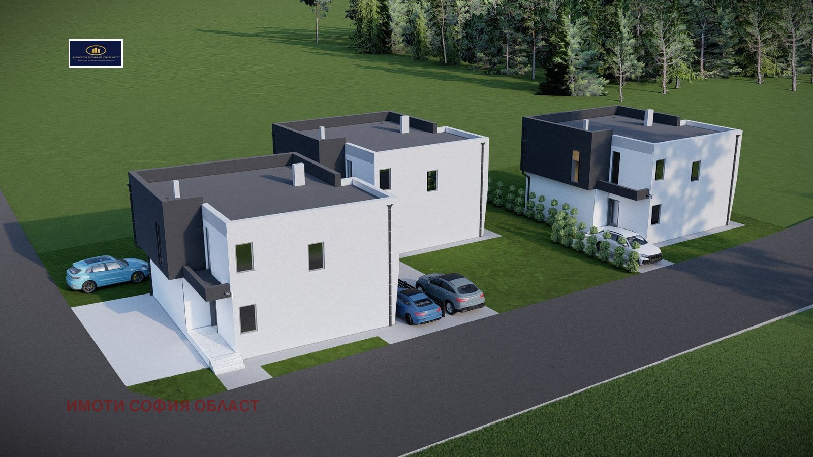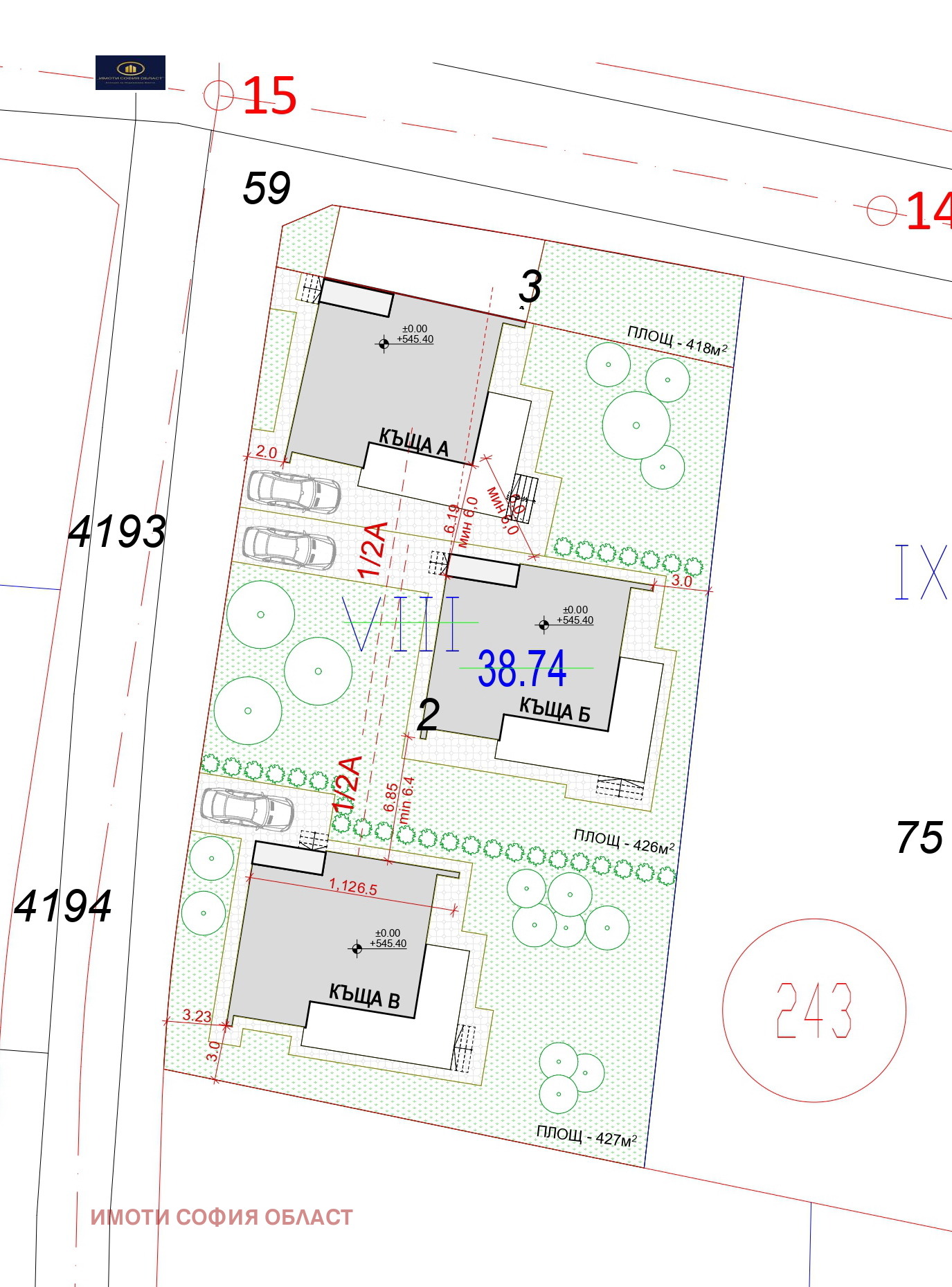 - Представяме Ви три еднофамилни къщи ( А, Б и В), всяка със собствен двор с площ от 418 ; 427 и 428 кв.м.