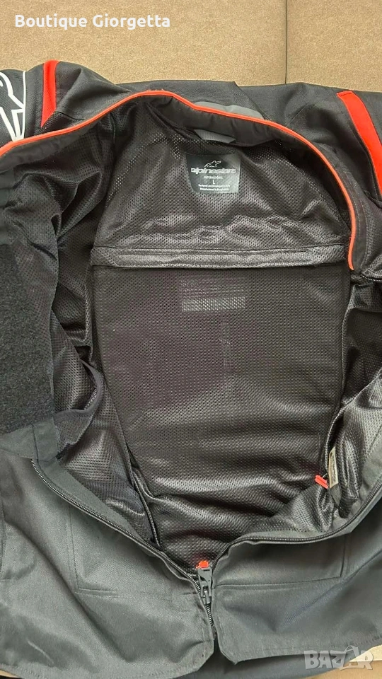Якето е без следи от употреба. Размер L .Носено е не повече от 2-3 пъти, но вече ми е малко. Към него давам допълнително протектор за гръб Alpinestars. Цената е в евро!