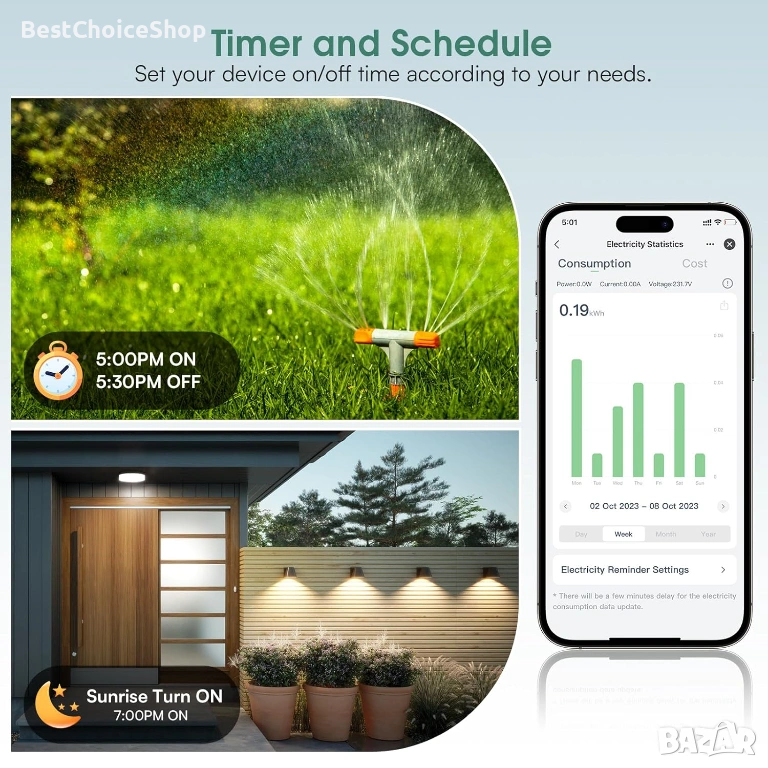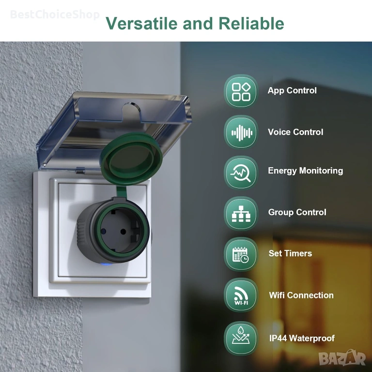 Контрол по всяко време и навсякъде: Включвайте и изключвайте устройствата си по всяко време и навсякъде. Независимо дали сте у дома, в офиса или на почивка, с нашия водоустойчив външен щепсел имате пълен контрол над устройствата си за употреба на открито (съвместим само с 2.4GHz WiFi).