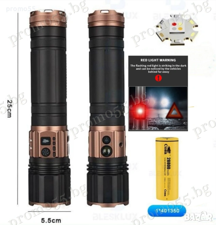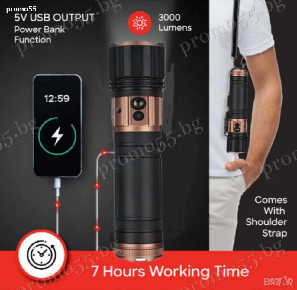 Мощен презареждащ се фенер с размер 25см., изработен от издръжлива алуминиева сплав, водоустойчив, удароустойчив и прахоустойчив, подходящ за употреба в дъждовни или влажни условия с високомощен лед чип, наричан още ”бял лазерен фитил” който осигурява силна и ярка светлина, осветяване на голямо и далечно разстояние до 1000м.