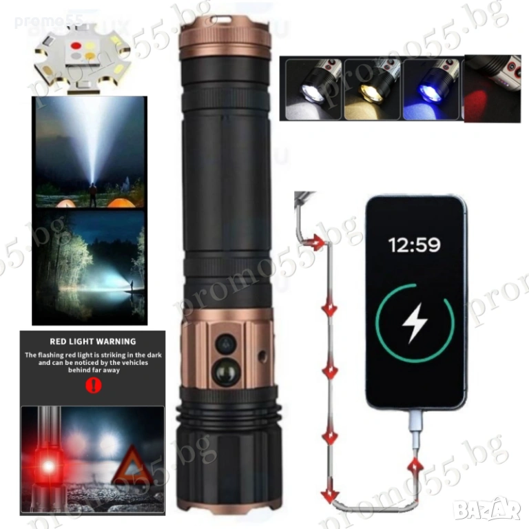 Функции за осветление: Разполага с LED светлина, лазер в три цвята и режими на работа като стробоскоп със странична Led аварийна светлина SOS, червена светкавица и бяла светлина.