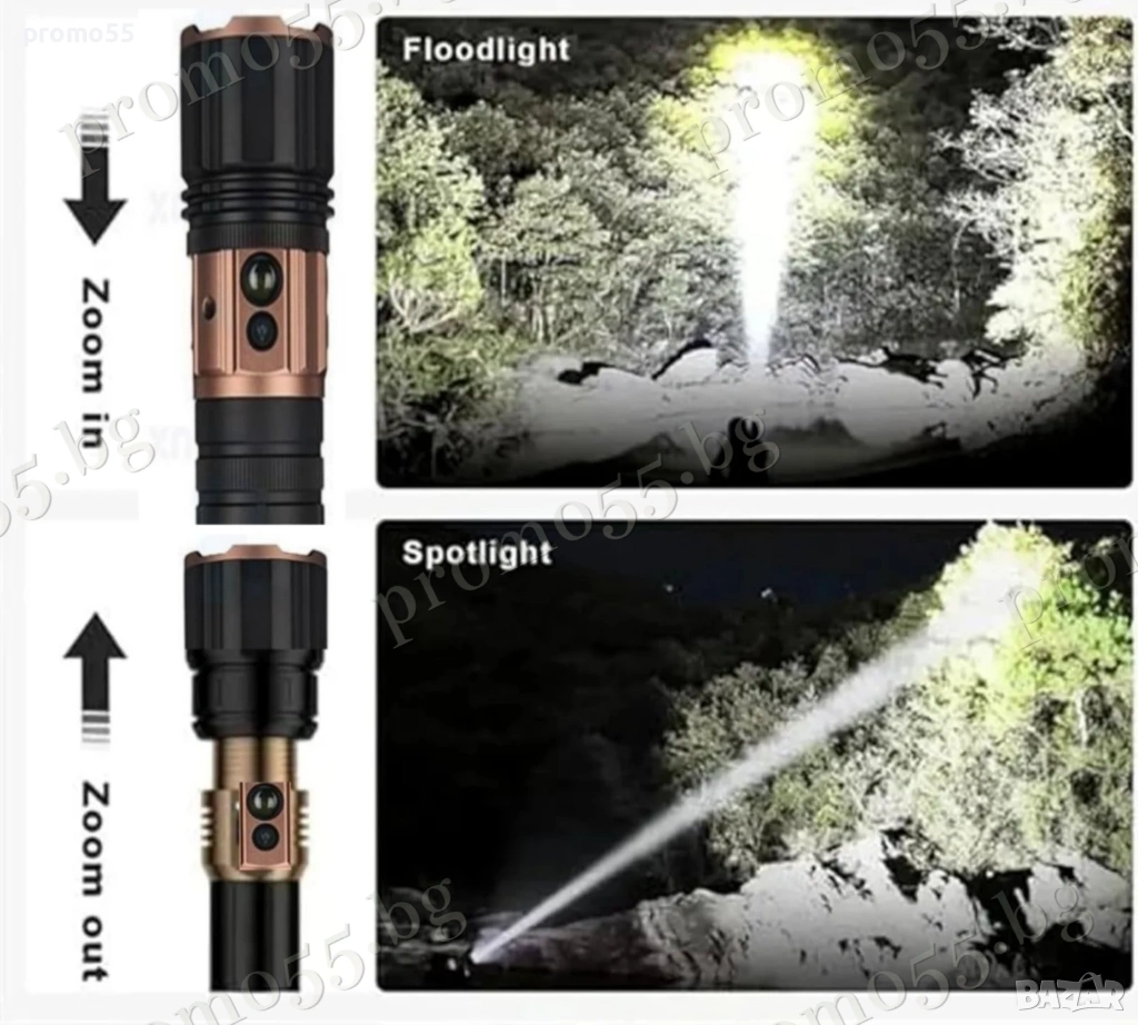 Този фенер е проектиран с телескопична функция за мащабиране, (zoom long shot) можете лесно да регулирате главата на фенерчето, за регулиране на фокуса от широк до тесен лъч.