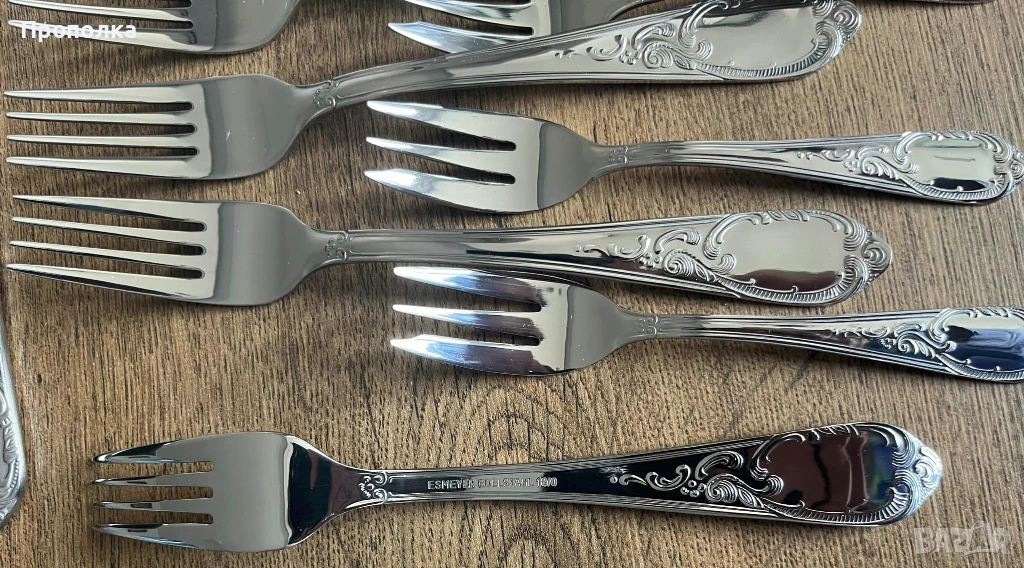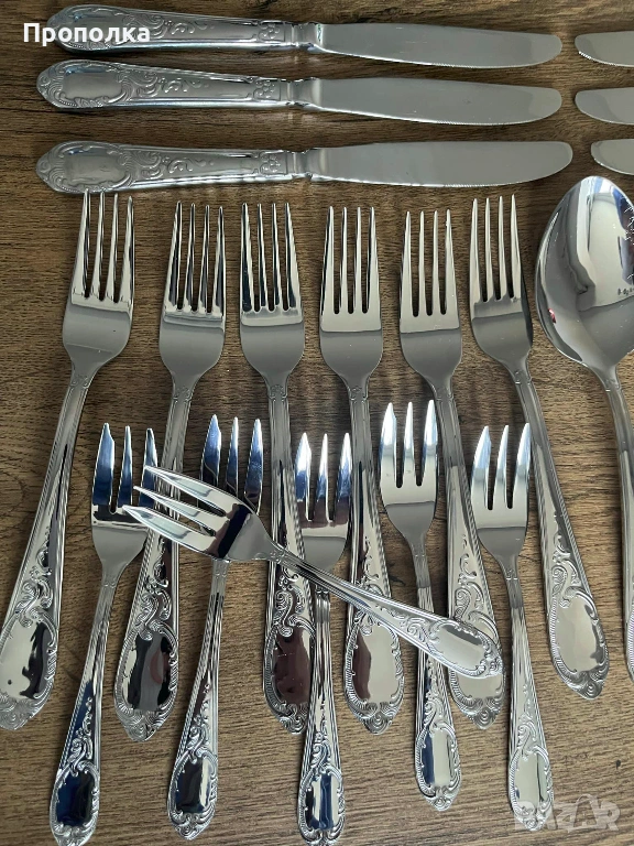 Комплекта включва Големи вилици, малки вилички, Големи лъжици и ножове по 6бр. от вид плюс две големи лъжици за сервиране. Неръждаема Стомана 18/0.
