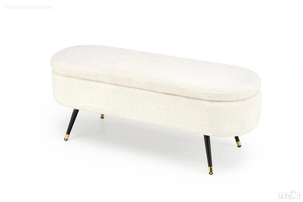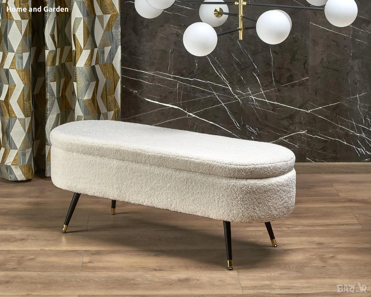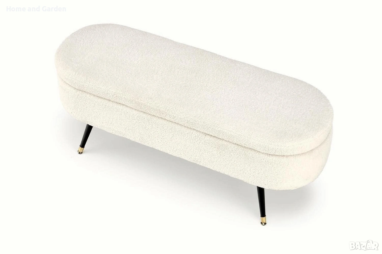 Елегантна пейка с мека тапицерия букле и скрито отделение за съхранение. Черните крака със златни накрайници добавят модерен луксозен акцент.