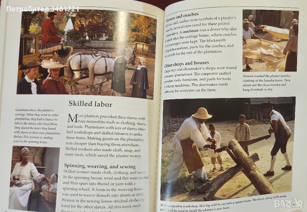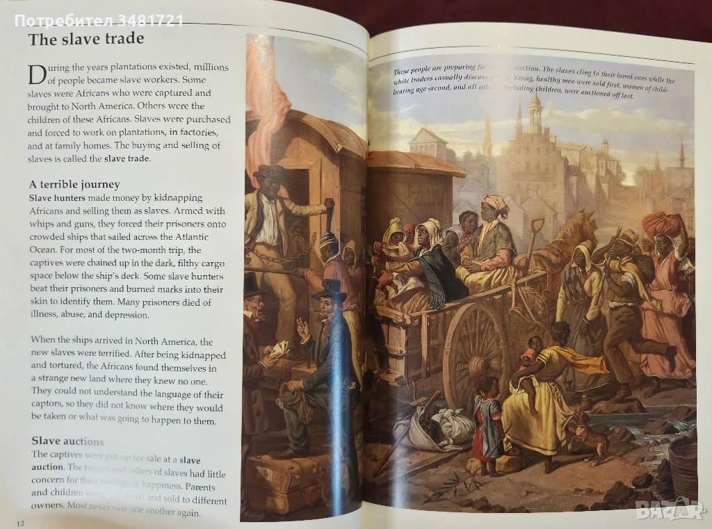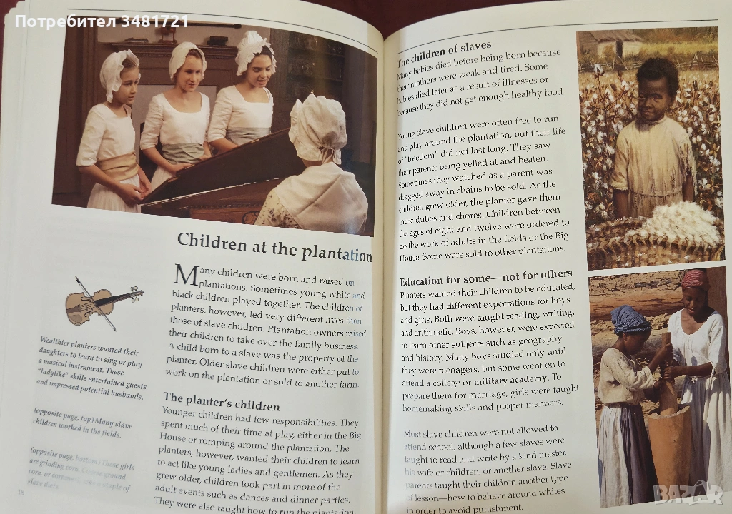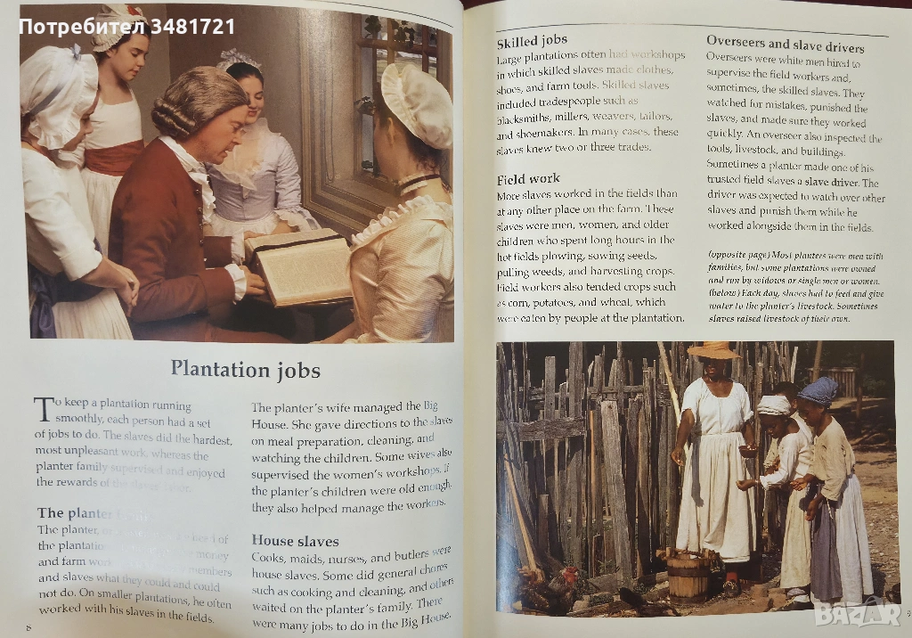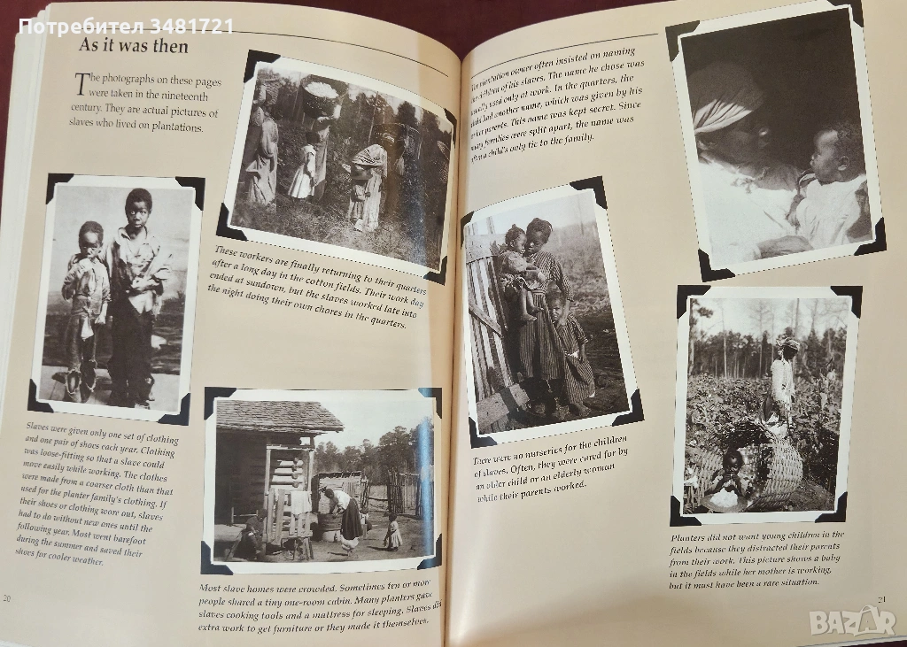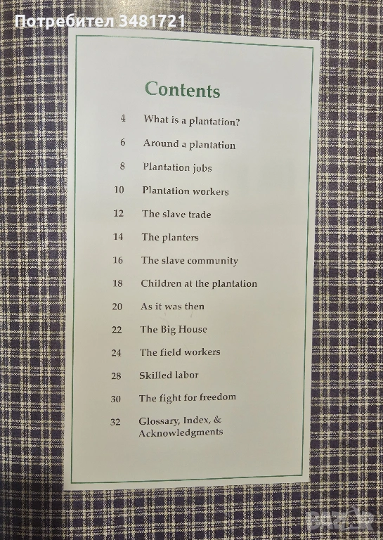 Накратко, но с много снимки и илюстрации, книгата представя животът в една американска плантация през миналите векове. Какво е плантацията, как функционира тя? Кой я управлява и какви са различните длъжности на живеещите в нея? Как робите стигат до живот в плантация и как живеят в нея? Какво работят и как се забавляват? Не на последно място - как те се борят за свободата си. Това са част от разгледаните въпроси. Книгата включва както много илюстрации, така и 2 типа снимки. Първите са възстановки на исторически събития и ежедневен живот, а вторите - автентични архивни снимки от живота на роби в една плантация.