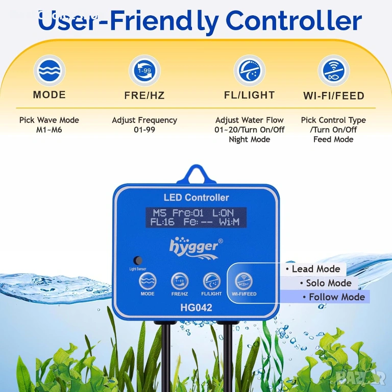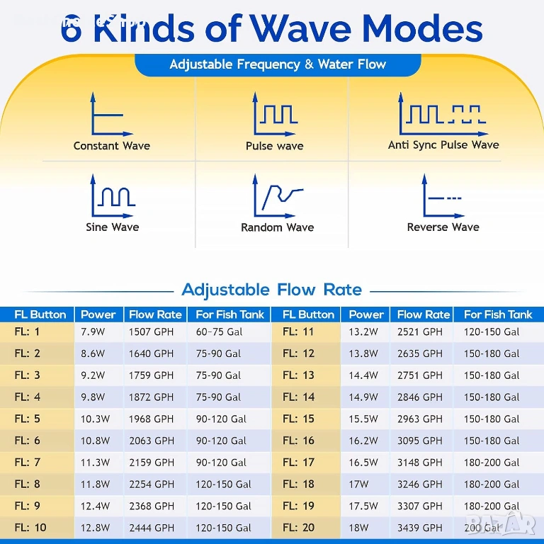 - 【Многофункционален контролер】 1) Налични са 6 режима на форма на вълната - постоянна вълна, импулсна вълна, антисинхронизирана импулсна вълна, синусоидална вълна, произволна вълна, обратна вълна; 2) Опции за нива на мощност 1-20; 3) Опция за интервал на потока 1-99; 4) Режим на подаване, изключва помпата за 10 минути по време на подаване; 5) Светлинен сензор за нощен режим, намалява нивото на мощност до 1