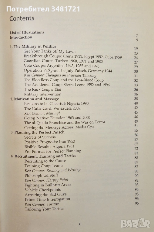 Книгата представя и анализира политическите, военните и социалните фактори, стоящи зад успешните и неуспешните преврати по света. Тъжен факт е, че превратът все още е една от често срещаните форми на смяна на властта в доста държави. Независимо дали става въпрос за еднолична диктатура, демократично избрано правителство или просто военна хунта, превратите в повечето случаи се формират от комбинация между жажда за власт, патриотизъм, алчност и желание за експлоатация на големи маси хора. Книгата изследва подробно факторите, които помагат(или пречат) при предварителната подготовка и извършването на преврат. Сред тях са време, медиен контрол, народна подкрепа и организационна структура на правителството, както и други специфични локални елементи. Представена в книгата е и таблица на военните преврати по света след Втората световна война, а последната ѝ глава прави прогноза за предстоящи след излизането ѝ преврати в различни страни, базирани на прогнозна таблица с въпроси, определена от авторите.