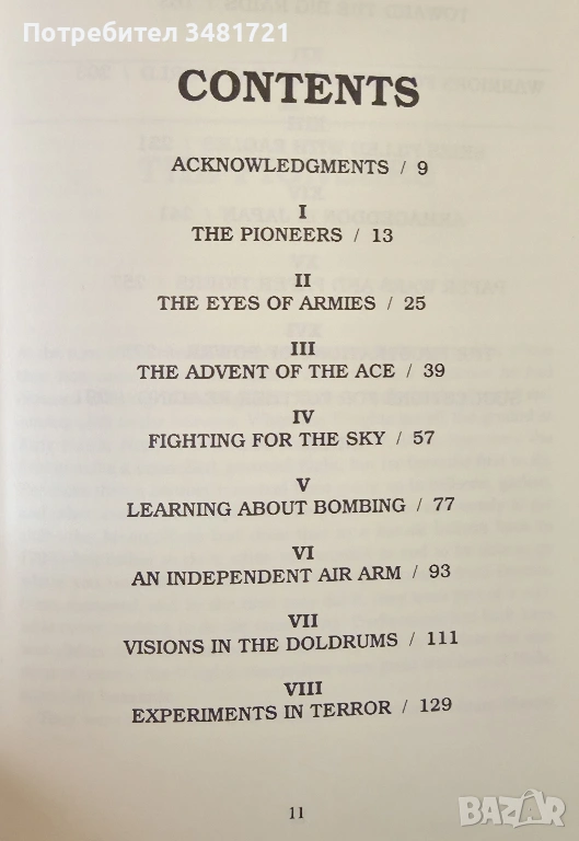 Книгата представя историята на военните действия, в които е използвана авиация, от италианското завладяване на Либия в началото на века до мащабното използване на военната авиация по време и след ВСВ. По същество, тя е история на това как армии по света осъзнават, че едно любопитно откритие може да се превърне първо в мощен разузнавателен апарат, а не след дълго - във всяващо ужас сред противниците бойно звено на армията. Разделена на 16 глави, книгата разказва подробно за всеки етап - от пионерите и първите "птичи очи" на армиите, през първите плахи тестове за бомбардировка от въздуха, до ада в Япония и събития през Студената война. Те са поставени в исторически и политически контекст, като е включена информация за ключови фигури и логика на събитията.