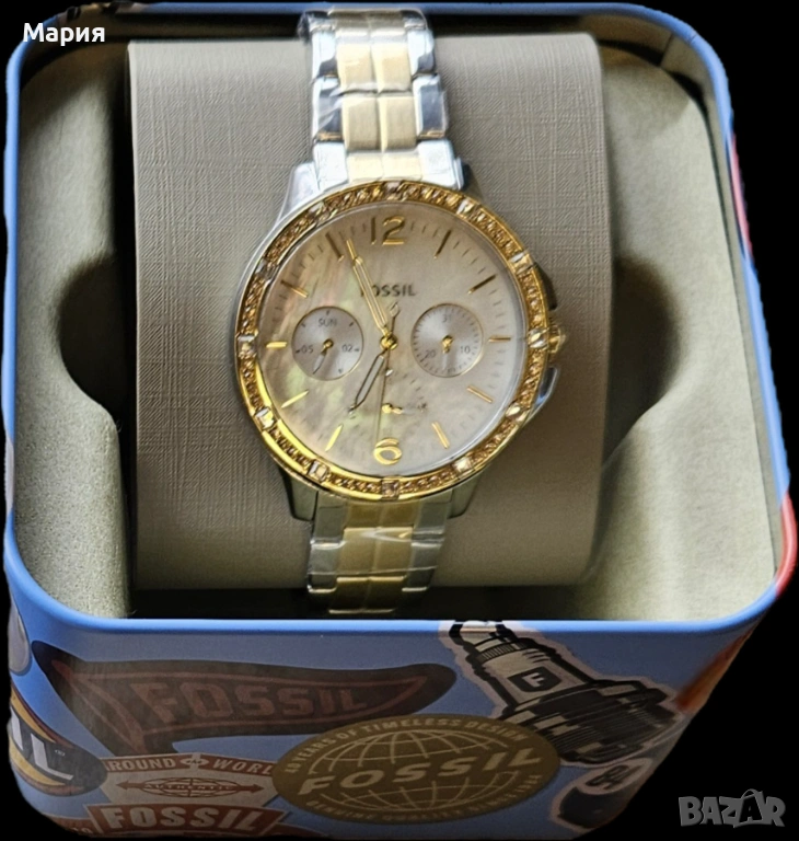 Нов дамски двуцветен (сребристо и жълто) лимитиран модел на Fossil. С протекторите, никога не е носен. Купен от Германия. Седефен циферблат.
