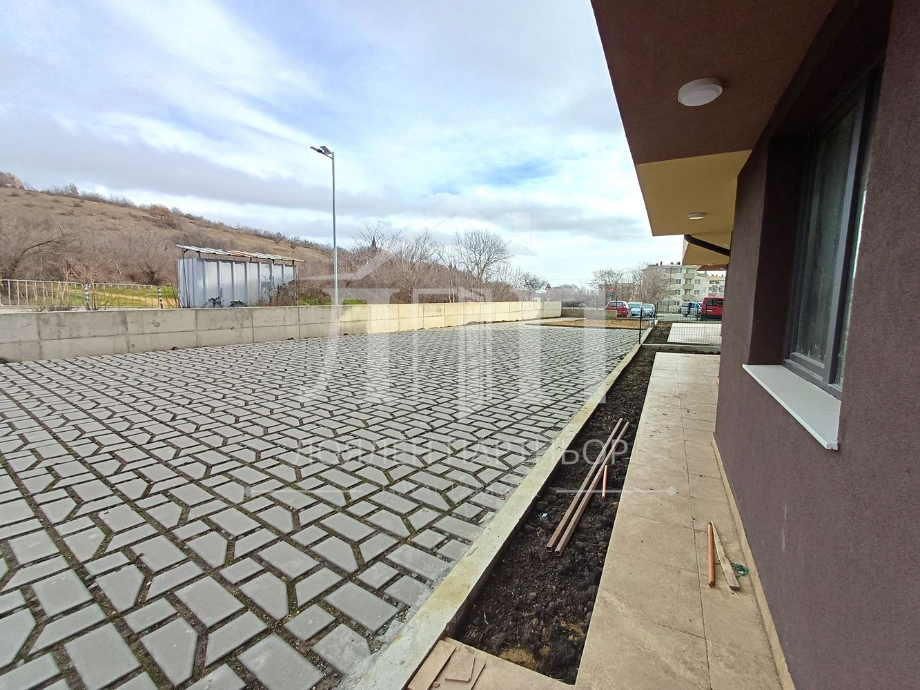 Дворно пространство: Напълно завършено с модерен декоративен паваж и предстоящо професионално озеленяване.