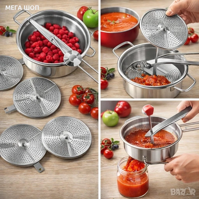Мелница/цедка за зеленчуци и плодове, 4 части, Неръждаема стомана