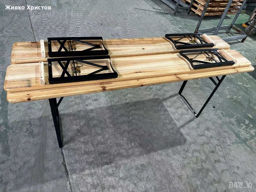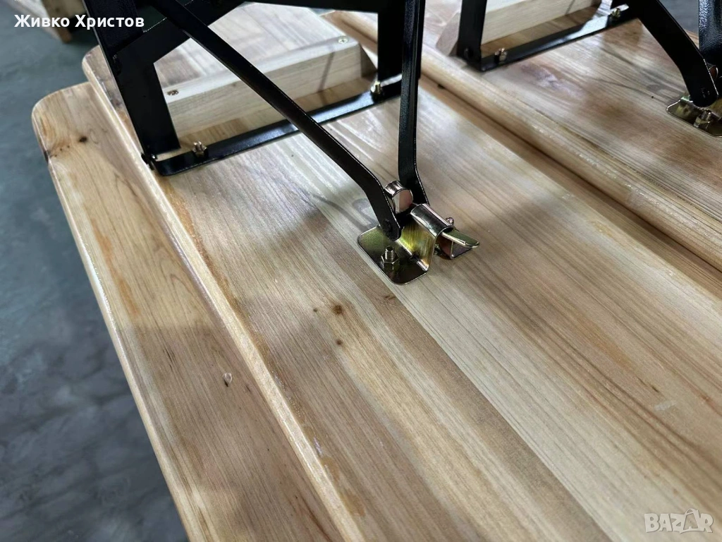 Сгъваеми дървени пейки с плот от масивно дърво и метална сгъваема конструкция.