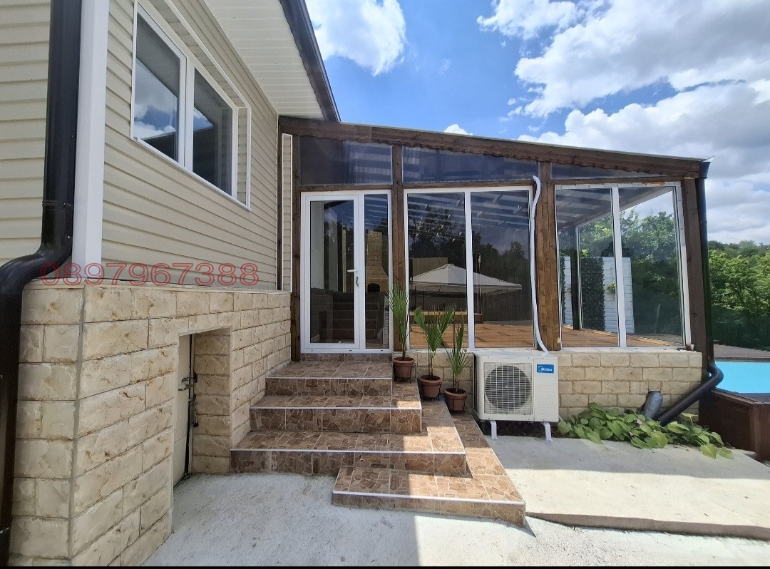 -Дневна 40кв.м тип остъклена веранда слънчева и просторна с френски прозорци, за да можете да се наслаждавате изцяло на гледката към балкана.