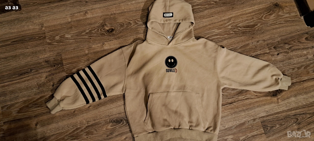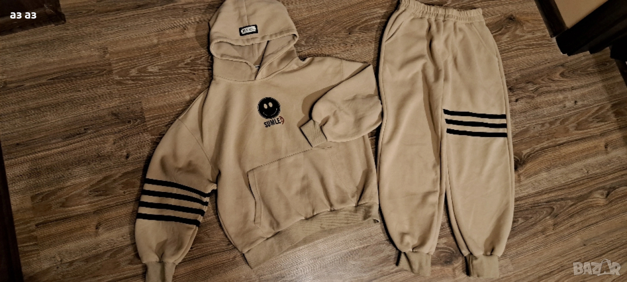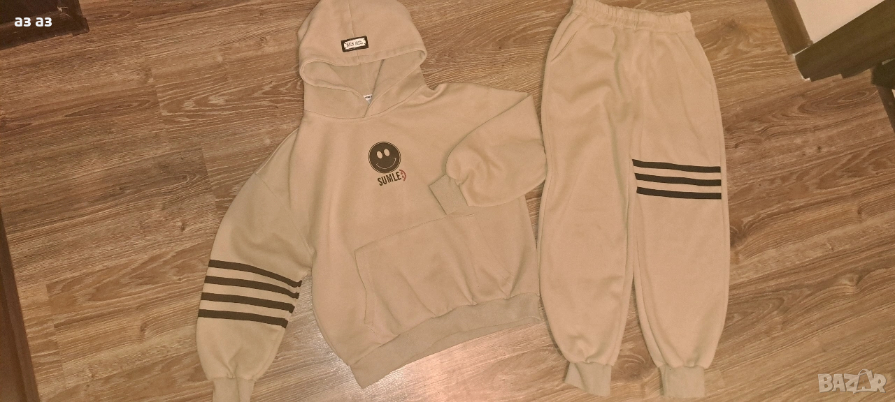 Долнището е с джобове и дължина 88см. Ширината на крачола в най-широката му част, точно под чатала е 28,5см Горнището също има общ джоб отпред,с качулка и дължина 53см. Модела е широк,под митниците е 56см измерено отпред.