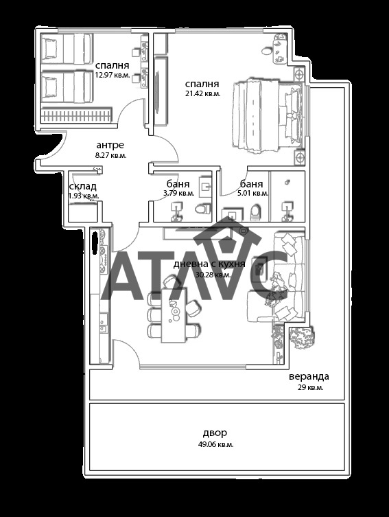 Апартаментът е тристаен с много добро разпределение. Състои се от просторна дневна с кухненски бокс и трапезария, две самостоятелни спални, две бани с тоалетни, склад, входно антре и веранда с озеленен двор, с обща площ 78,60 кв.м. Жилището е светло, функционално и подходящо както за семейство, така и за инвестиция.