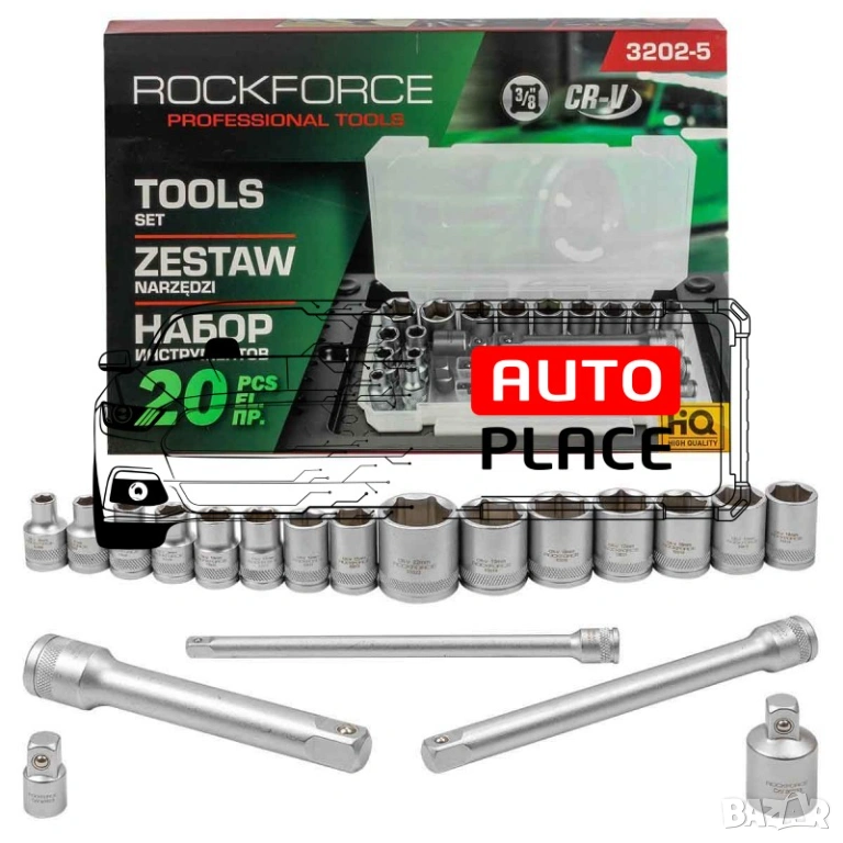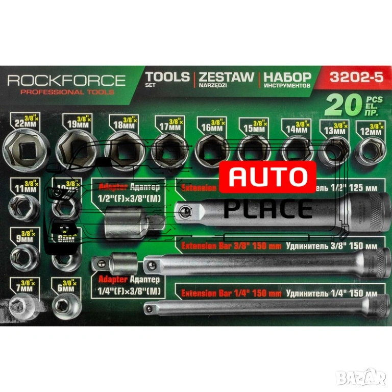 Комплект вложки RockForce RF-3202-5 се състои от 20 части, включващи вложки, удължения и преходници. Комплектът се доставя в удобна пластмасова кутия за съхранение и пренасяне.