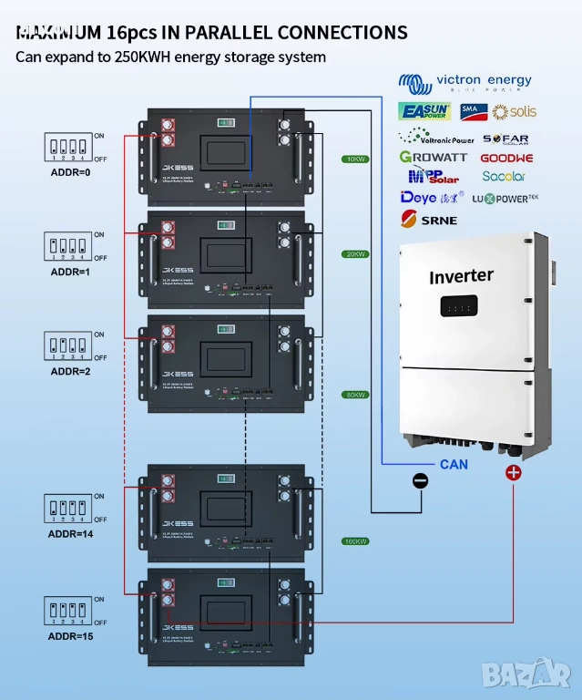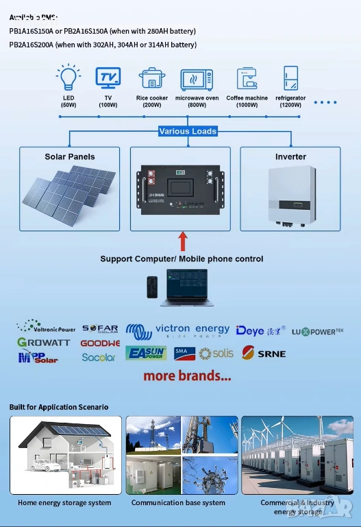 Съвместим с инвертори от марки като Deye, Growatt, EaSUN, Victron, Voltronic и други - което му позволява да бъде част от слънчеви или автономни енергийни системи.