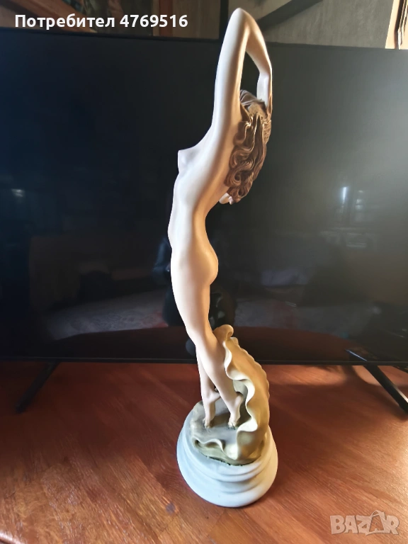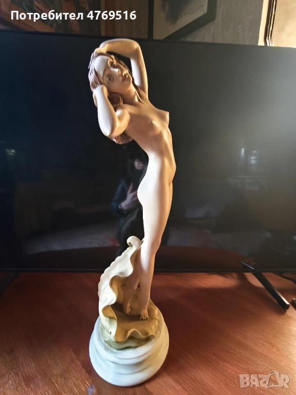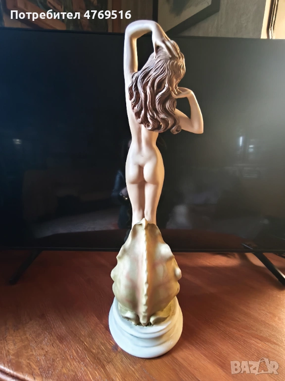 Статуетката представлява гола женска фигура, вероятно Венера, изправена върху морска раковина, която от своя страна е поставена върху кръгла основа. Фигурата е с извито тяло, ръце вдигнати над главата и поглед, насочен нагоре. Косата е стилизирана на вълни. Повърхността е гладка и показва фини детайли в чертите на лицето, косата и анатомията на тялото.