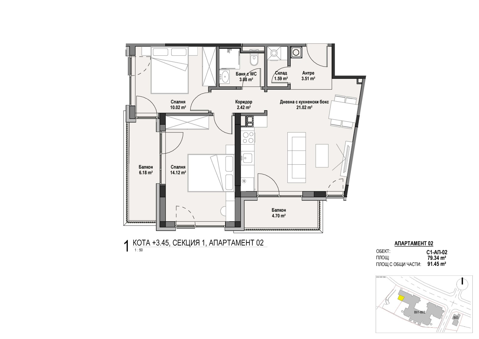 Апартаментите се състоят от антре, дневна с кухненски бокс, две спални, баня с тоалетна и тераса.