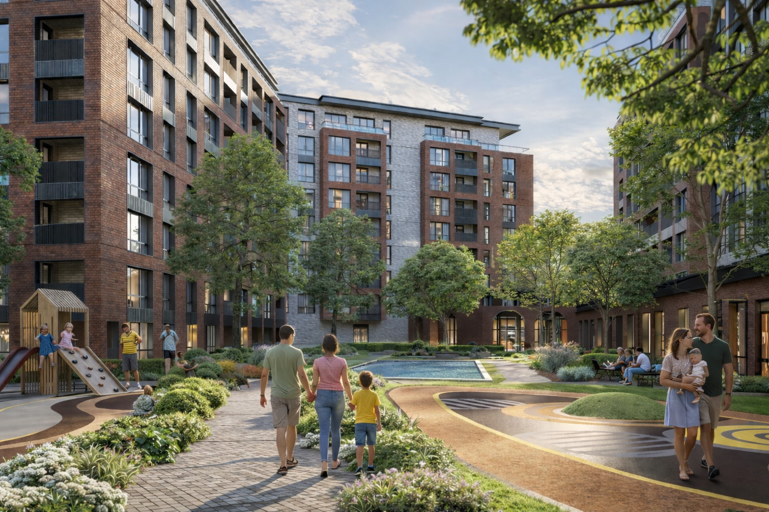 Озеленен вътрешен двор с водно огледало и детски зони
