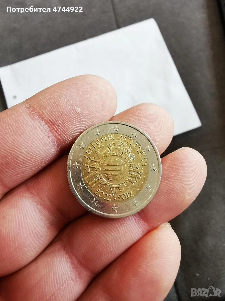 Възпоменателна емисия от 2 евро, издадена от Австрия през 2012 г.. Тя отбелязва 10-годишнината от въвеждането на евро банкнотите и монетите. При интерес пишете тук или на Вайбър