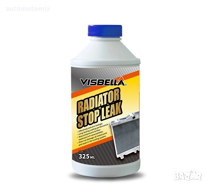Visbella Radiator Stop Leak е формулиран с естествени растителни влакна, втвърдител, агенти против ръжда, и агент против пяна.