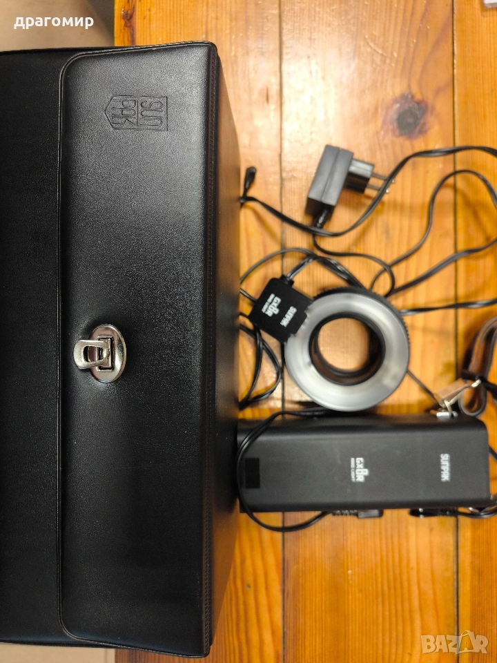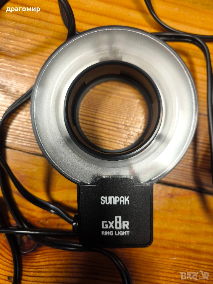 продавам светкавица за обективи,49,55,58 мм,SUNPAK GX8R RING LIGHT, работи на ток и на батерии, имам още много други фотоапарати, камери, обективи, чанти, светкавици, батерии, зарядни устройства, касети, филтри, ремъци, ленти, при закупуване на повече неща отстъпка