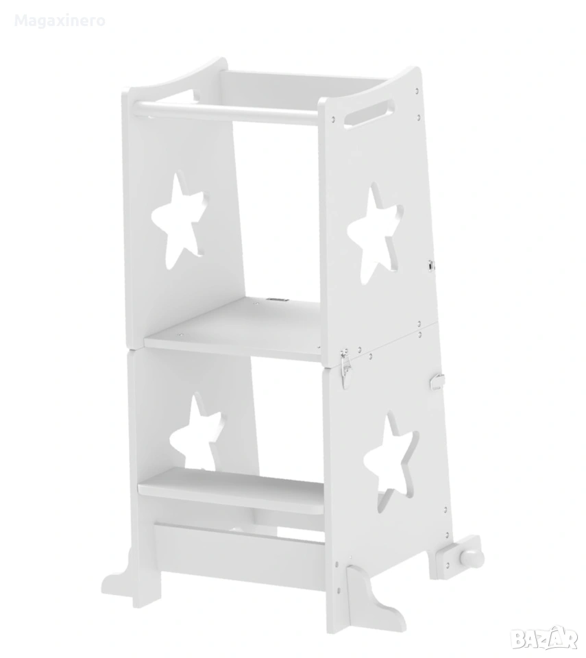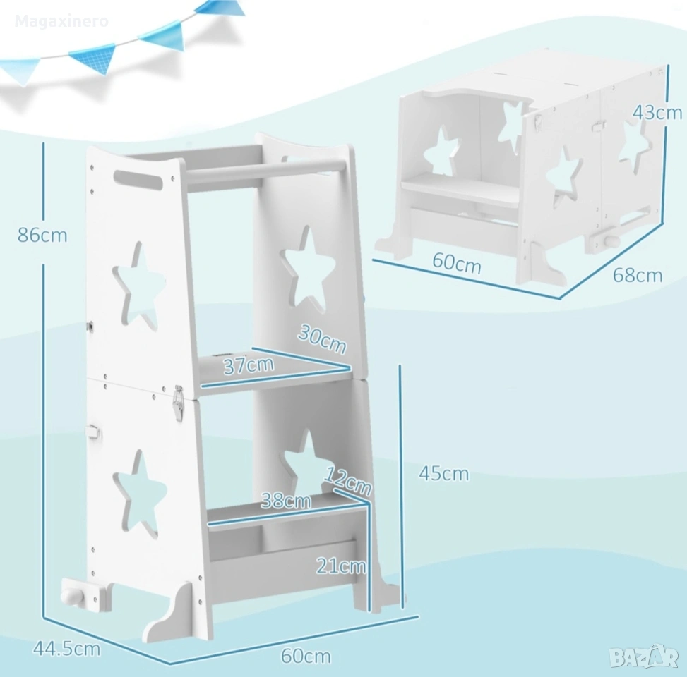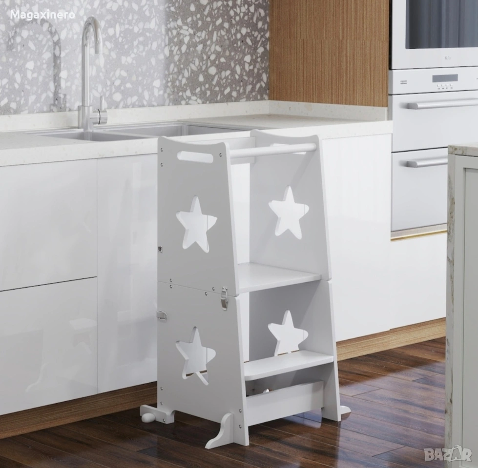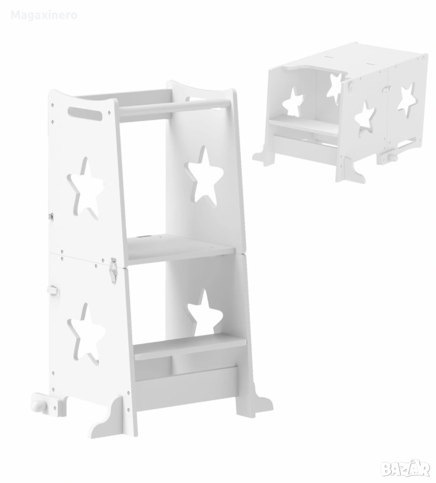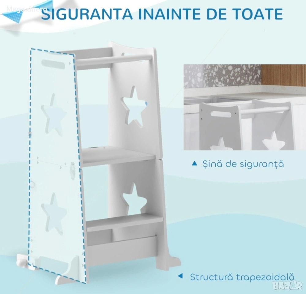 Забележка: Това описание е преведено автоматично на български език. Открийте стълбата Монтесори AIYAPLAY за деца, която съчетава безопасност и гъвкавост за първите изживявания на вашите малки! Тази трапецовидна конструкция с предпазни решетки може лесно да се трансформира в комплект детска маса и столове. Стълбата е изработена от издръжлива борова дървесина и MDF и е перфектна за кухнята и банята, като поддържа първата фаза на детската автономия. БЕЗОПАСЕН ДИЗАЙН: Снабдена с трапецовидна структура и предпазна щанга за облягане, тази детска стълба гарантира максимална безопасност в първите етапи на откриване и учене. РАЗНОСТРАННА ТРАНСФОРМАЦИЯ: Нашият Монтесори комплект може лесно да се трансформира в практична детска стълба във вашата стая. КАЧЕСТВЕНИ МАТЕРИАЛИ: Изработена от издръжлива борова дървесина и MDF, тази Монтесори кула е проектирана да издържи и поддържа стреса на деца на възраст от 3 до 6 години МНОГООБРАЗЕН КОМФОРТ: Повече от просто кухненска табуретка за деца, конструкцията може да се използва и като стъпало за мивката в банята и като стълба за достигане на леглото, осигурявайки безопасност във всеки ъгъл на къщата. Капацитет на тегло: 30 кг. Изисква се монтаж