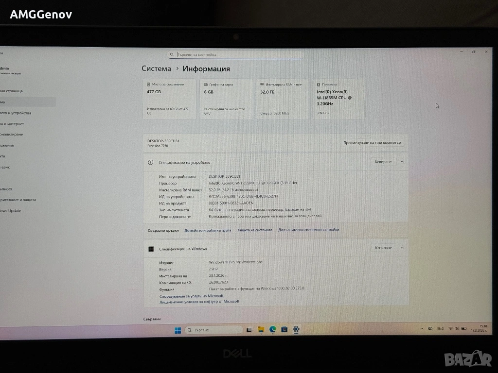 —- Dell Precision 7760 - 17.3’ Full HD IPS 500nits / Intel Xeon W11855M 6-ядрен/12-нишки 18MB Cache / 32GB DDR4 3200Mhz / 512GB SSD Nvme/ Nvidia RTX A3000 6GB GDDR6 / Подсветка—-