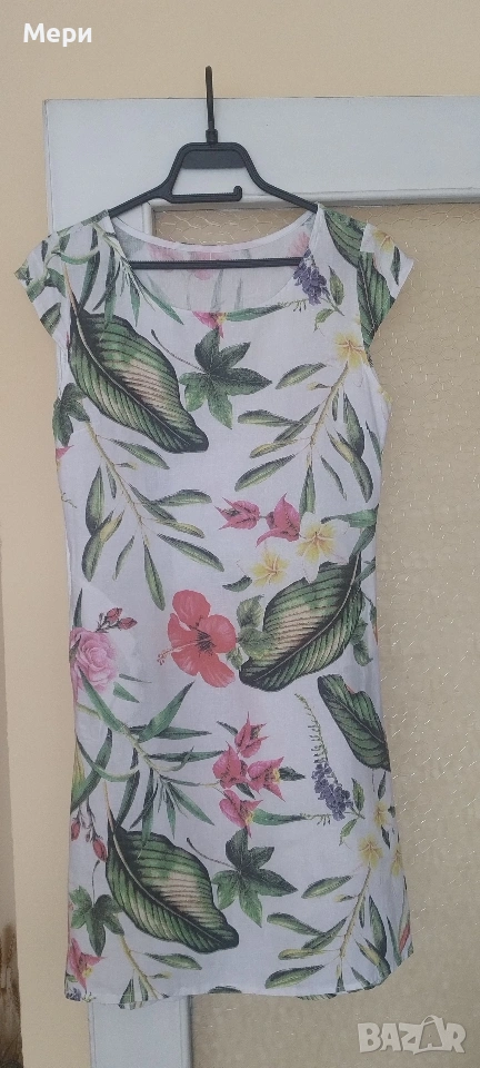 Ленена рокля, с две джобчета, размер М. Дължина 94 см. Гръдна обиколка 90 см. Ханш 94 см. За София може лично предаване.